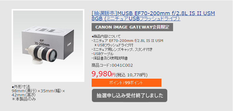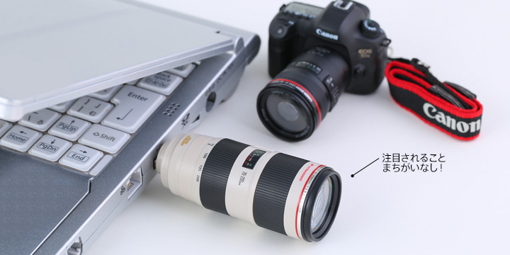 キヤノンのLレンズのミニチュアUSBメモリで、限定個数の抽選販売です。