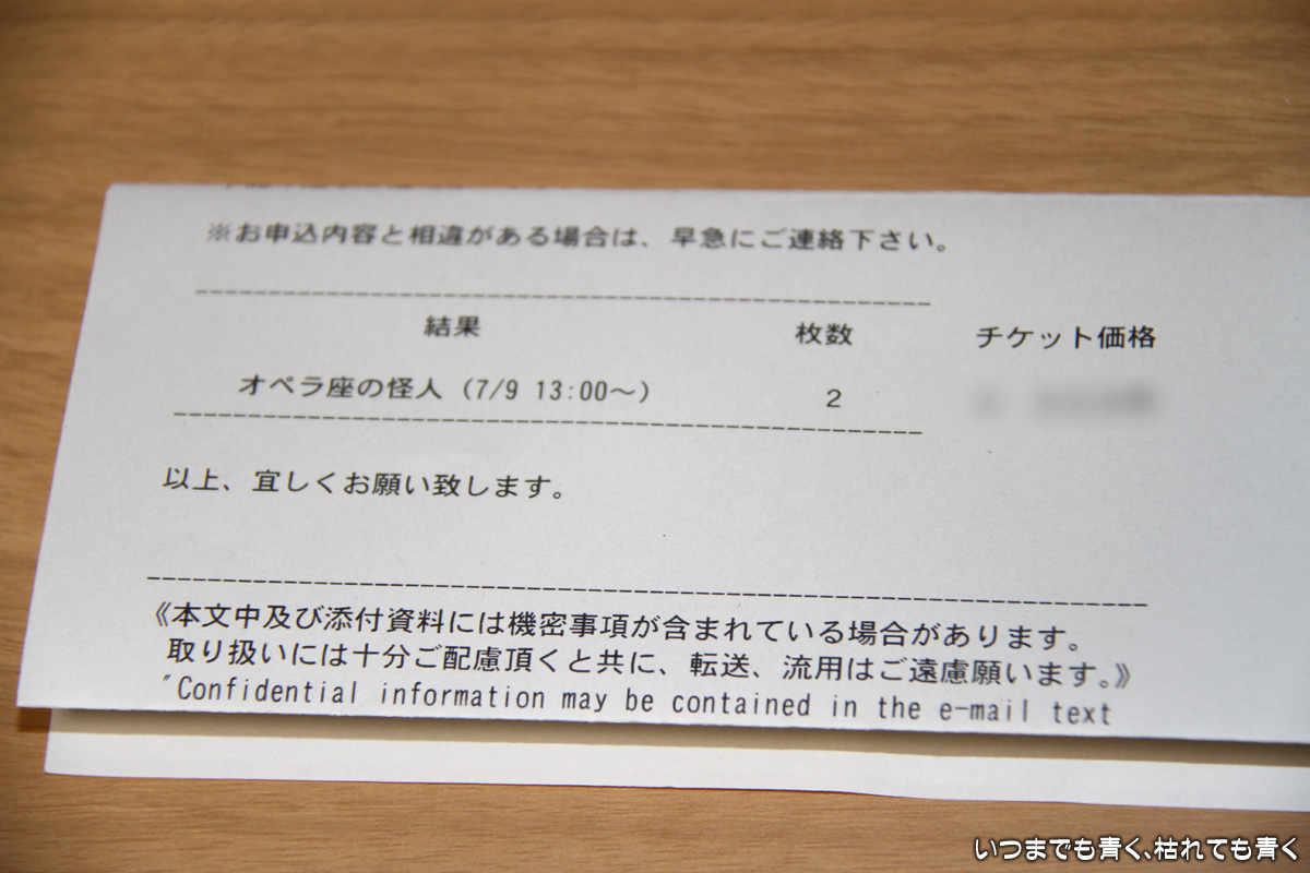 チケットは、勤務先の部長会で斡旋されたもので、3週間ほど前にチケットは届いていました。きちんと確認しておけばよかったのですが、昨夜行く準備をしてチケットを確認したら、なんと7/3(日)公演のもの。申込は7/9(土)しかしなかったし、申込結果もちゃんと7/9(土)になっています。