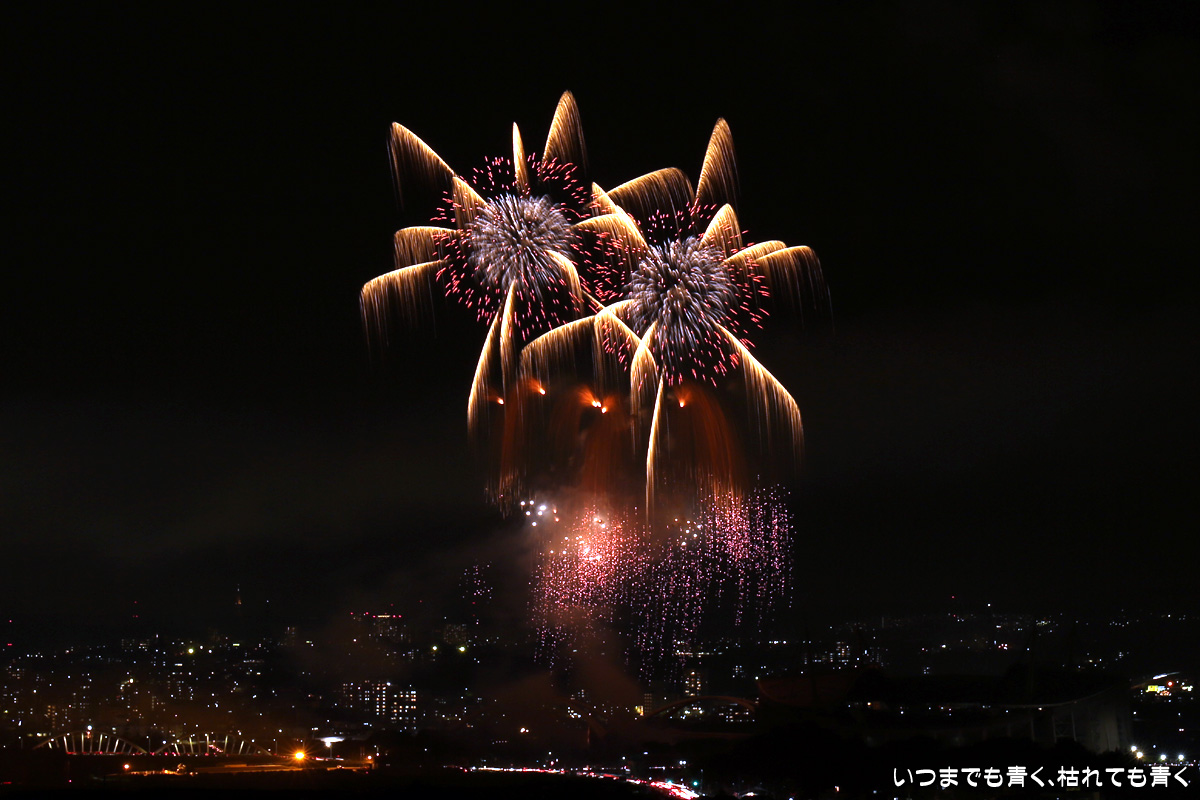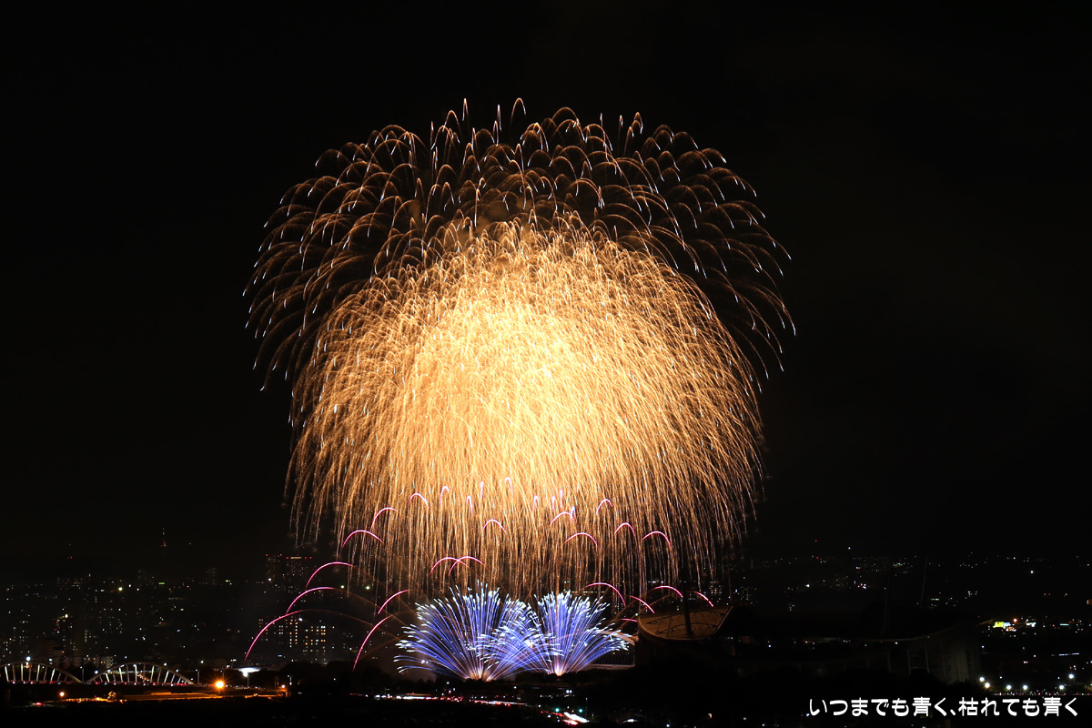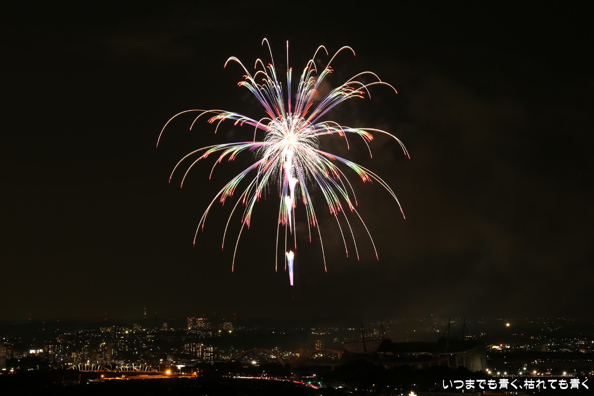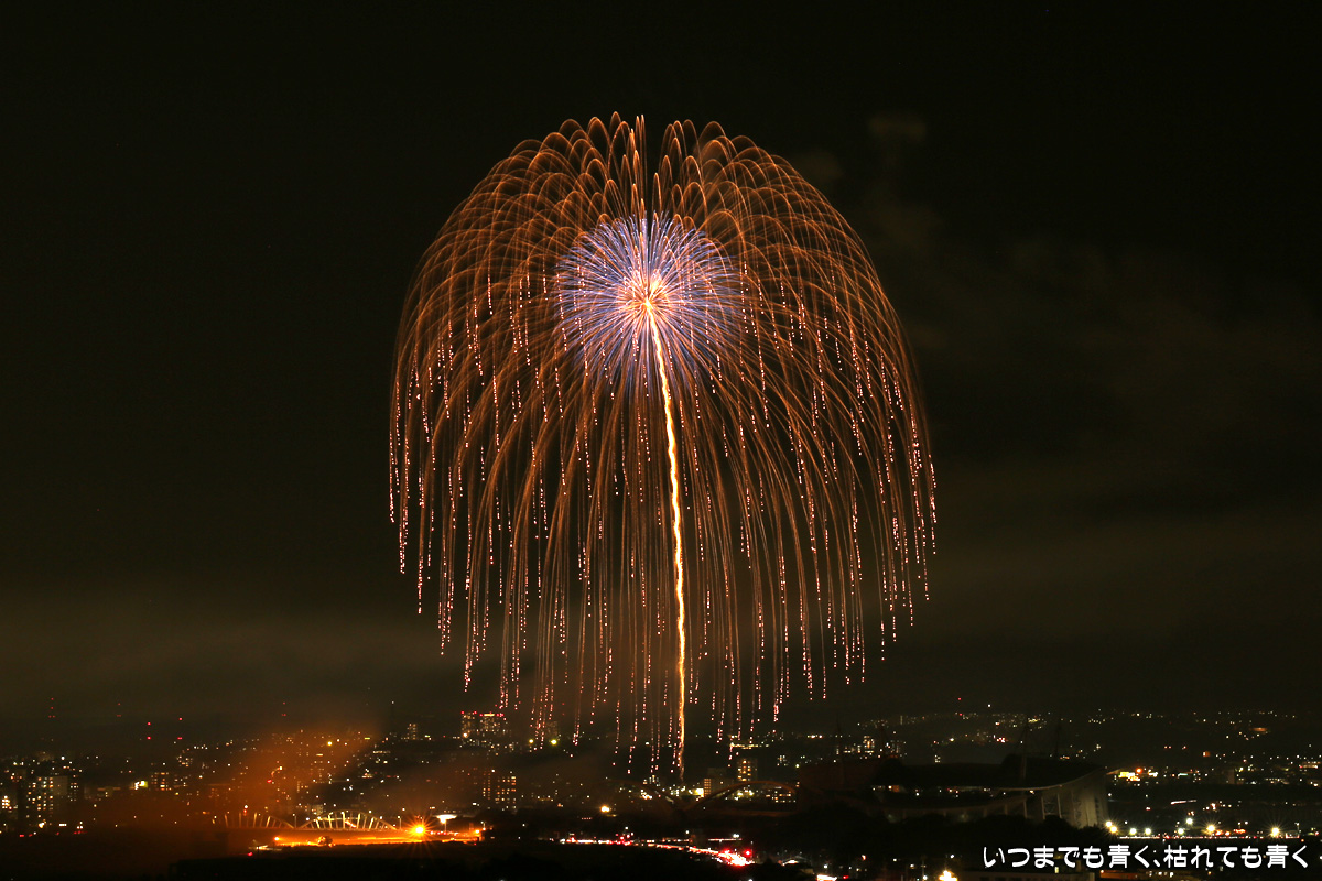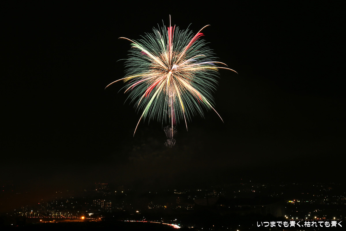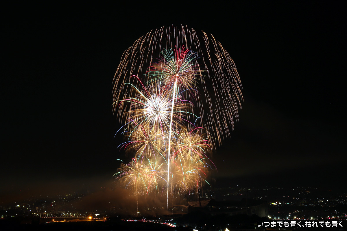 今年は、余裕を持ちすぎて出遅れてしまい3時に現地に着いたのですが、すでに特等席は三脚で場所取りがされていて、ちょっと窮屈な撮影となりました。機材は、カメラをEOS 5D MarkⅢにするかEOS 7D MarkⅡにするか、レンズを24-70mm標準でいくか100-400mm望遠でいくかで迷いました。昨年の反省として、「花火の軌跡をもっとシャープに撮りたい」ということがあったので、最終判断は、カメラはEOS 5D MarkⅢ、レンズは100mmだと大玉がはいらないかもということで24-70mm標準にしたのですが、結果的には花火が小さすぎてトリミングが必要な絵ばかりになってしまいました。あとで思うと、EOS 7D MarkⅡと24-70mm標準が良かったかなとちょっと悔いの残る撮影となってしまいました。もっとレンズのバリエーションも必要ですね。もし来年も元気で来れるならば、リベンジしたいと思います。