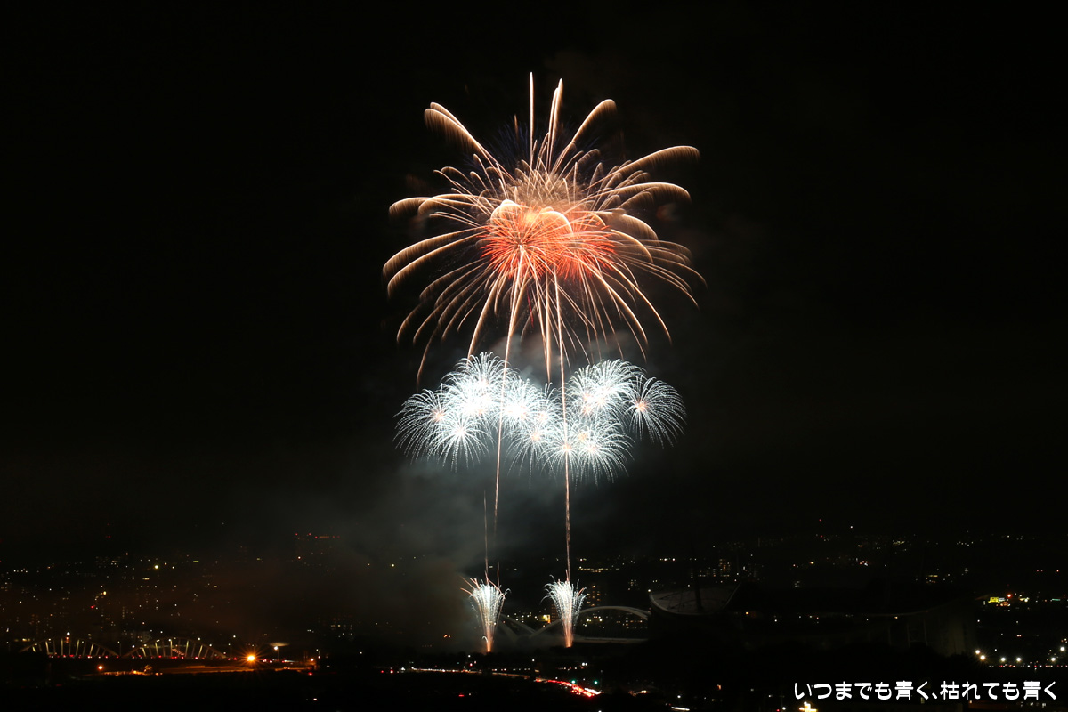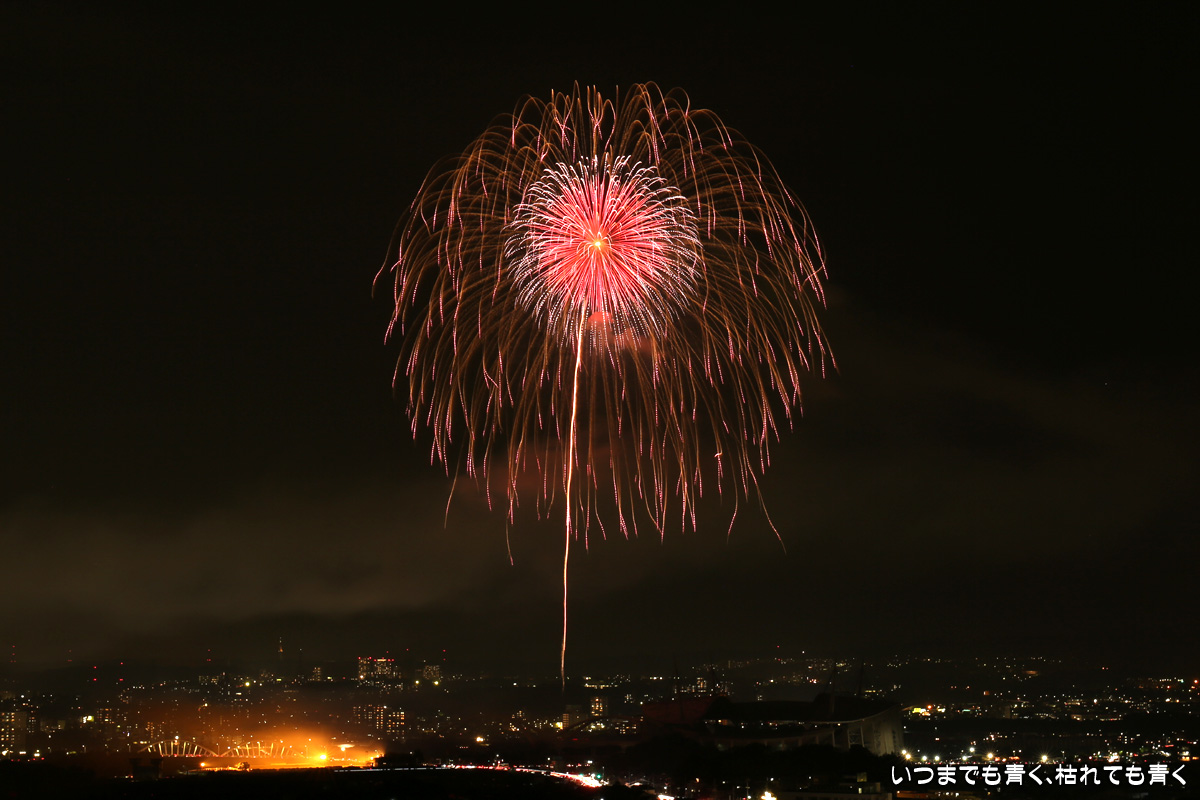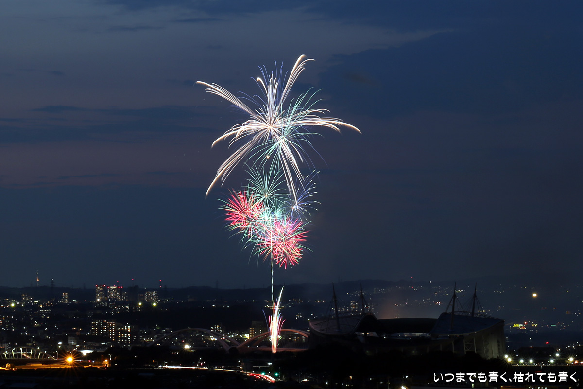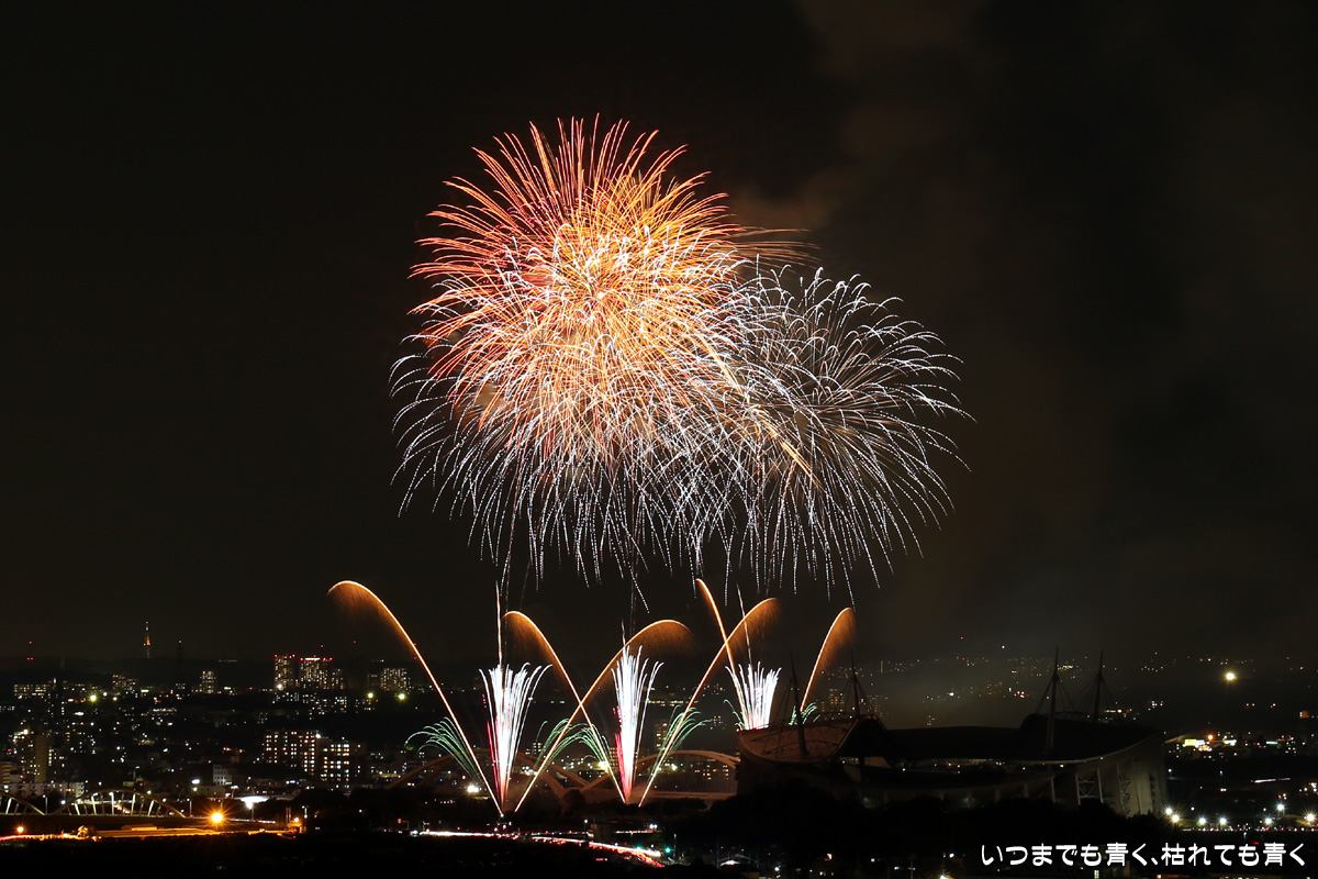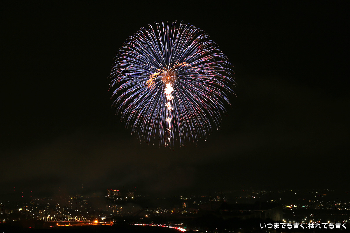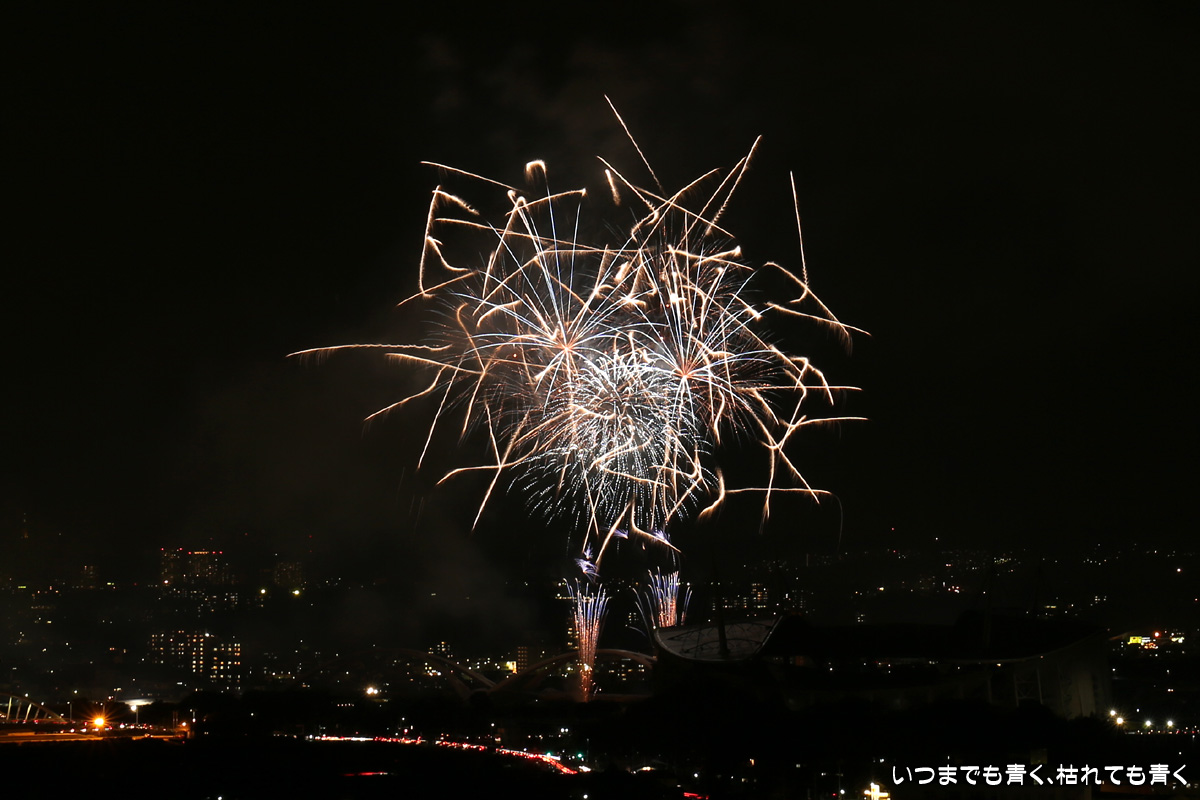 今年は、余裕を持ちすぎて出遅れてしまい3時に現地に着いたのですが、すでに特等席は三脚で場所取りがされていて、ちょっと窮屈な撮影となりました。機材は、カメラをEOS 5D MarkⅢにするかEOS 7D MarkⅡにするか、レンズを24-70mm標準でいくか100-400mm望遠でいくかで迷いました。昨年の反省として、「花火の軌跡をもっとシャープに撮りたい」ということがあったので、最終判断は、カメラはEOS 5D MarkⅢ、レンズは100mmだと大玉がはいらないかもということで24-70mm標準にしたのですが、結果的には花火が小さすぎてトリミングが必要な絵ばかりになってしまいました。あとで思うと、EOS 7D MarkⅡと24-70mm標準が良かったかなとちょっと悔いの残る撮影となってしまいました。もっとレンズのバリエーションも必要ですね。もし来年も元気で来れるならば、リベンジしたいと思います。