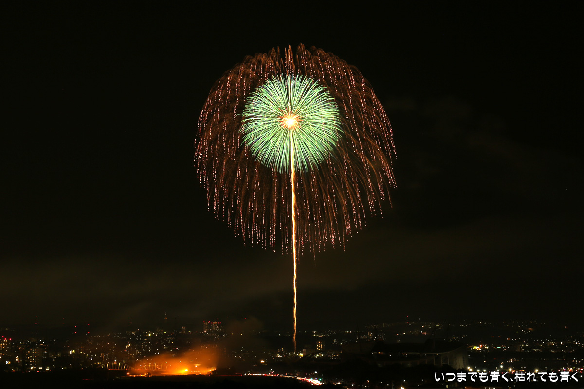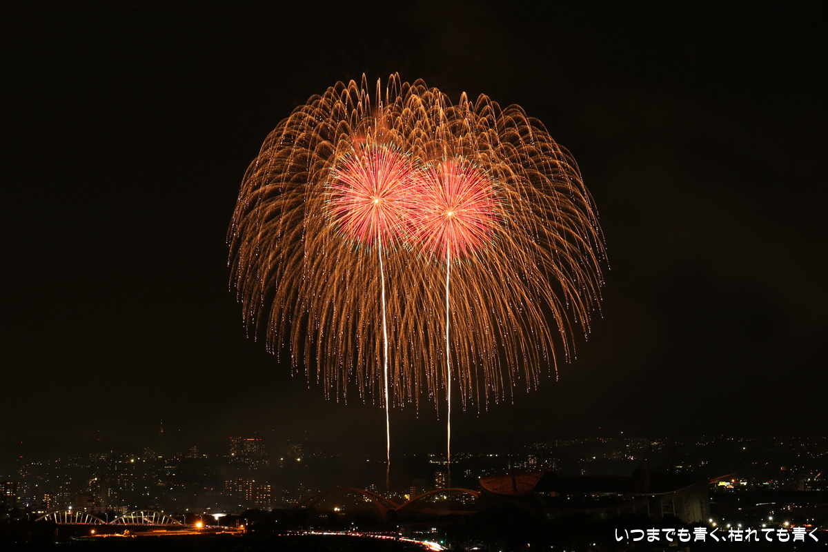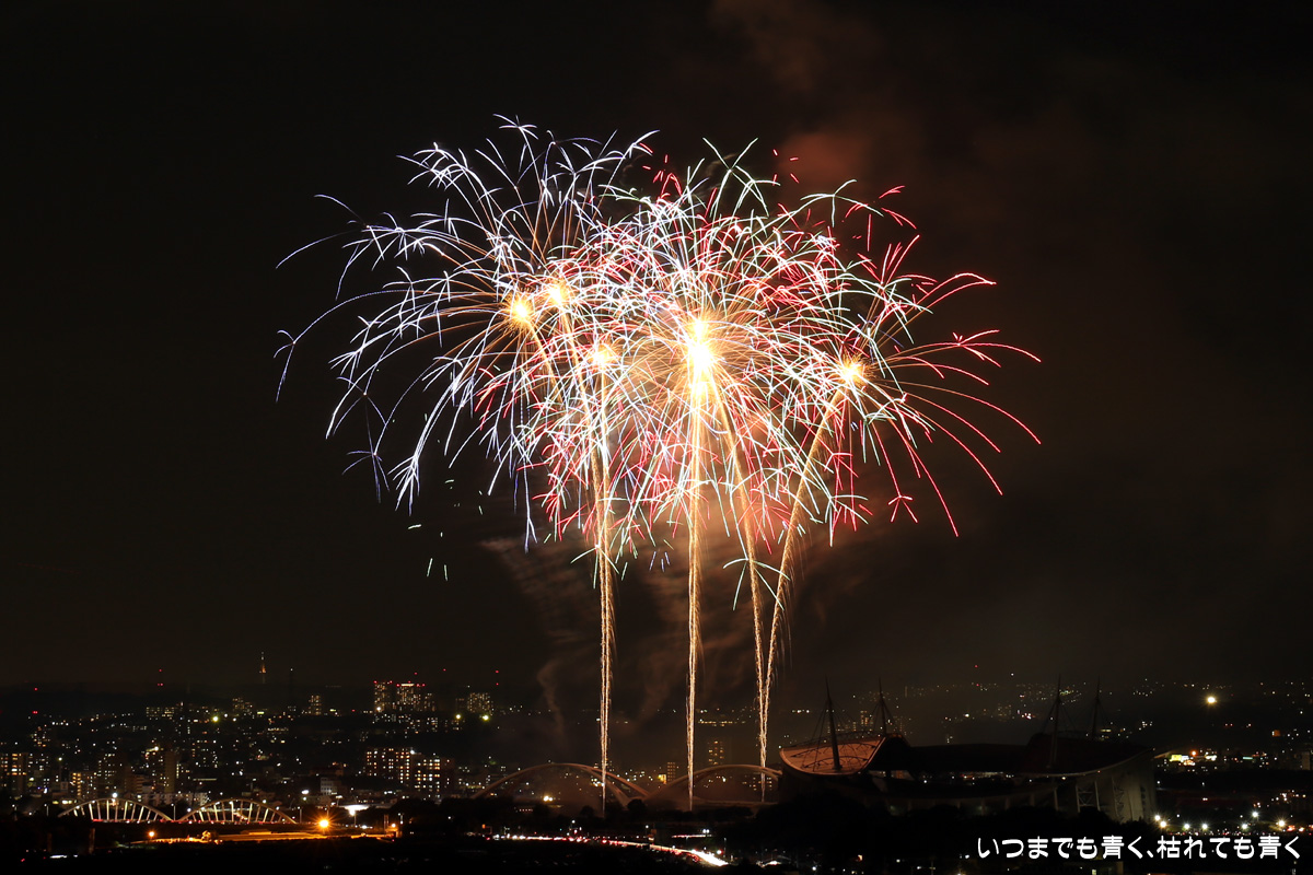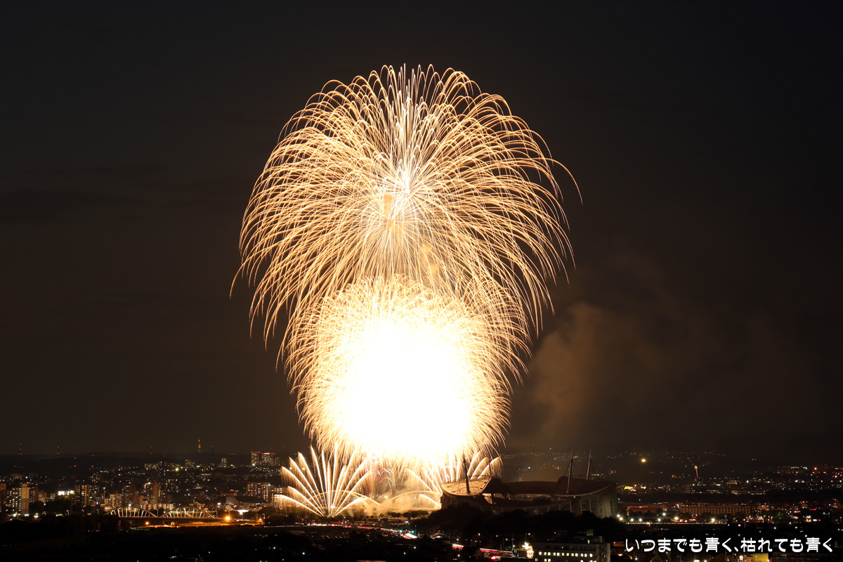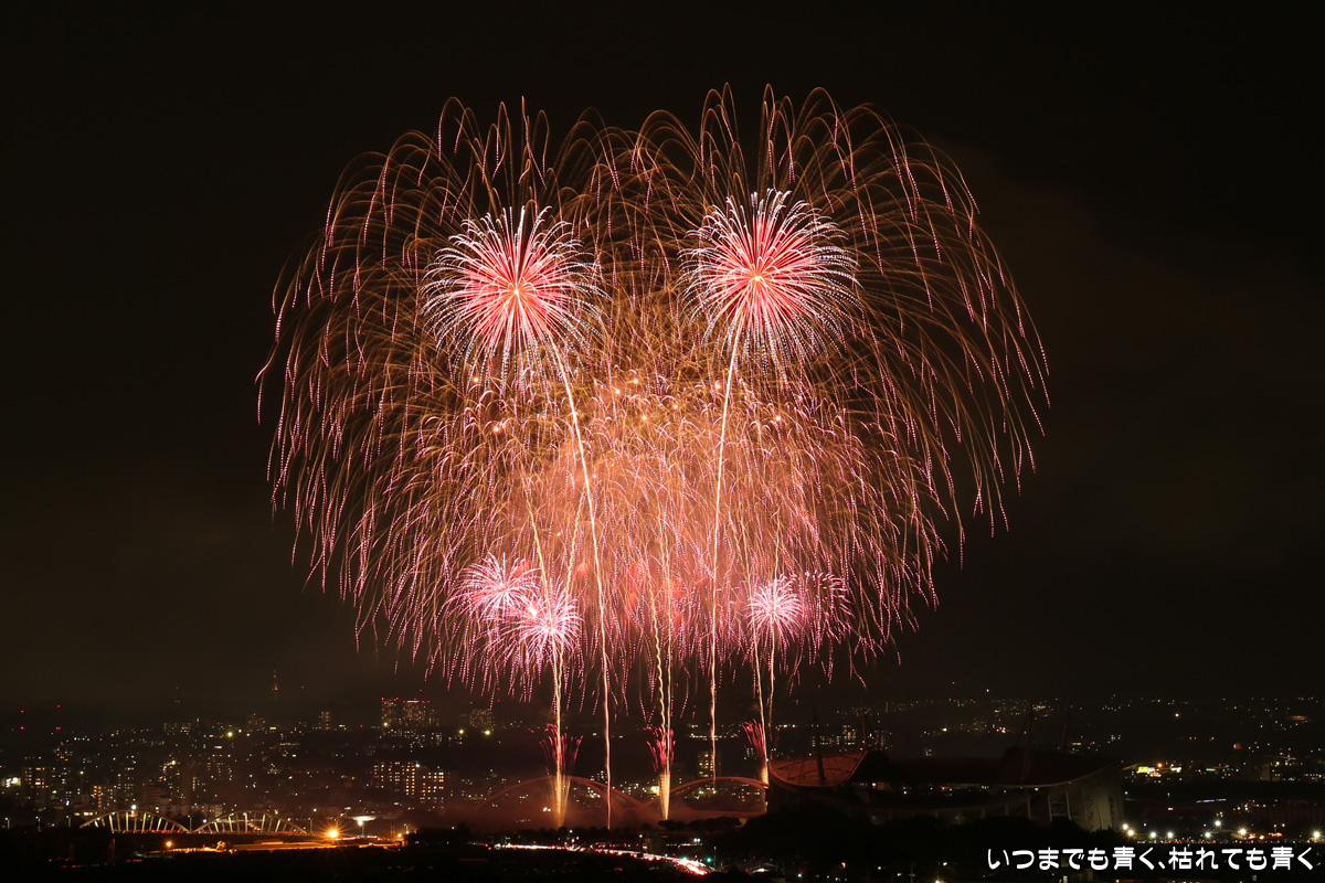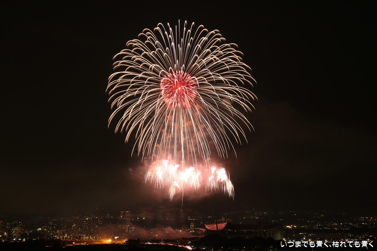 今年は、余裕を持ちすぎて出遅れてしまい3時に現地に着いたのですが、すでに特等席は三脚で場所取りがされていて、ちょっと窮屈な撮影となりました。機材は、カメラをEOS 5D MarkⅢにするかEOS 7D MarkⅡにするか、レンズを24-70mm標準でいくか100-400mm望遠でいくかで迷いました。昨年の反省として、「花火の軌跡をもっとシャープに撮りたい」ということがあったので、最終判断は、カメラはEOS 5D MarkⅢ、レンズは100mmだと大玉がはいらないかもということで24-70mm標準にしたのですが、結果的には花火が小さすぎてトリミングが必要な絵ばかりになってしまいました。あとで思うと、EOS 7D MarkⅡと24-70mm標準が良かったかなとちょっと悔いの残る撮影となってしまいました。もっとレンズのバリエーションも必要ですね。もし来年も元気で来れるならば、リベンジしたいと思います。