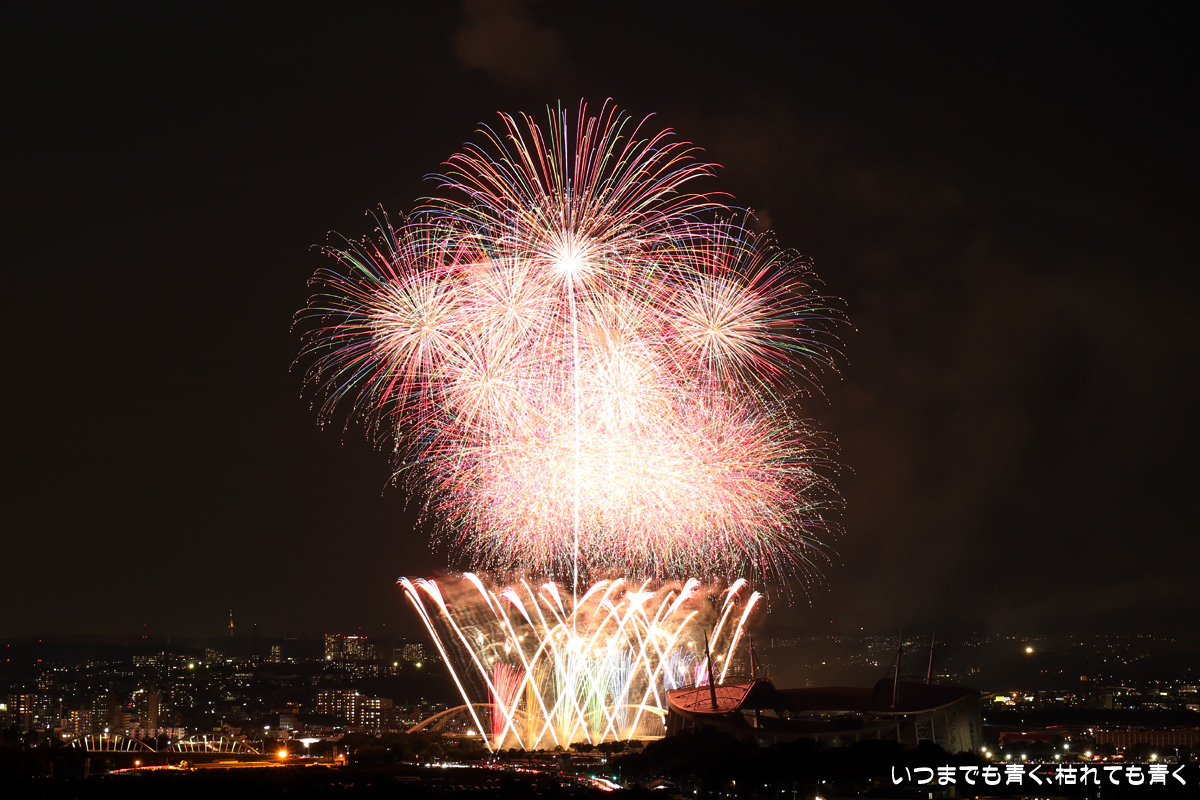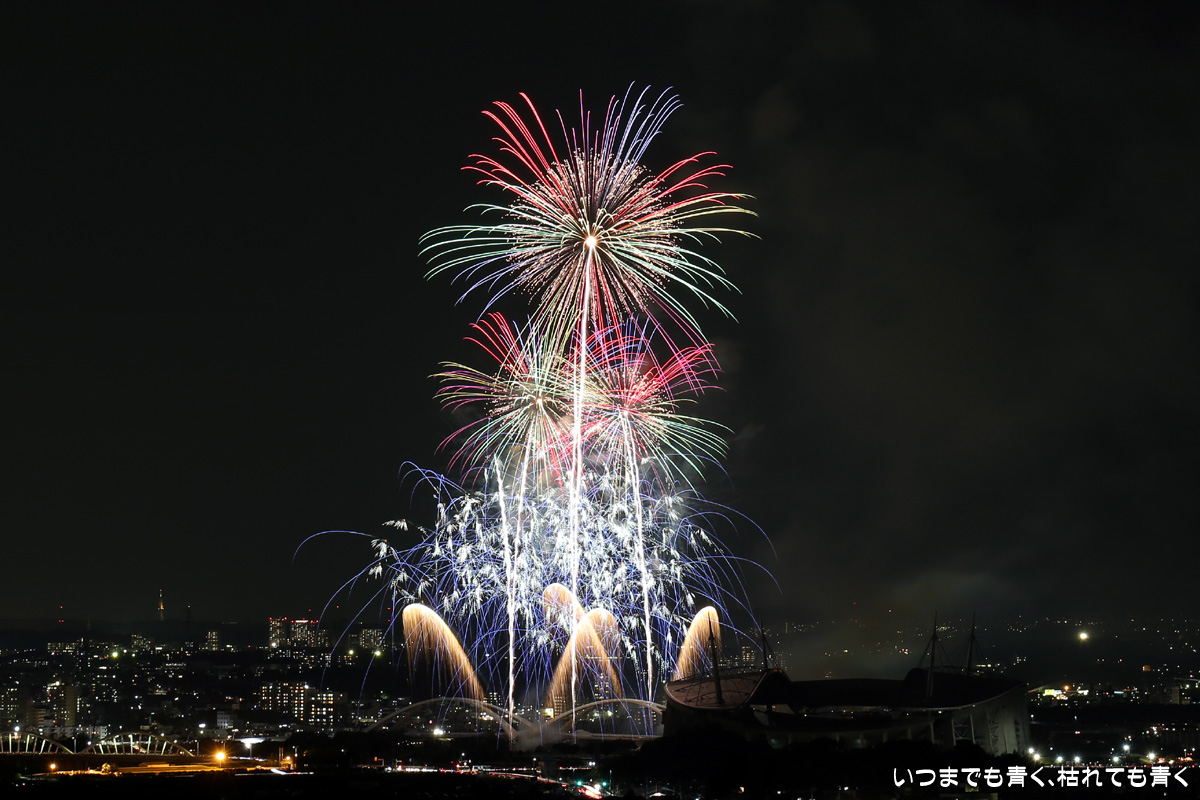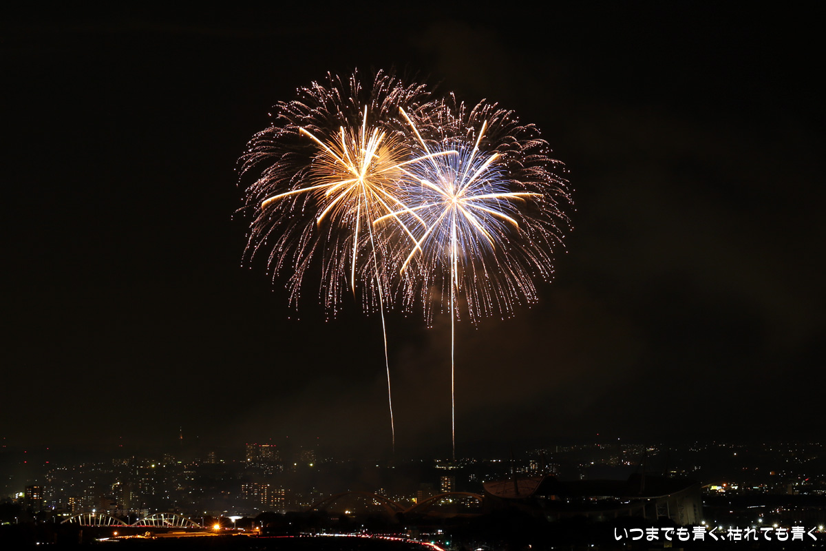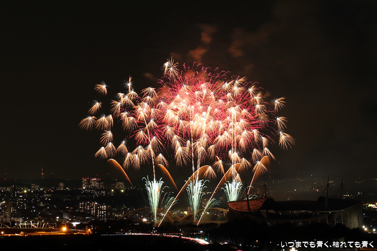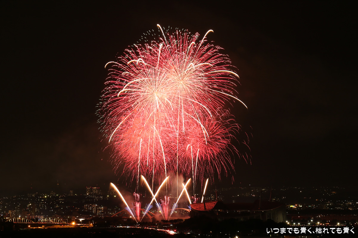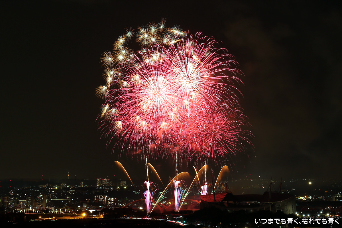 今年は、余裕を持ちすぎて出遅れてしまい3時に現地に着いたのですが、すでに特等席は三脚で場所取りがされていて、ちょっと窮屈な撮影となりました。機材は、カメラをEOS 5D MarkⅢにするかEOS 7D MarkⅡにするか、レンズを24-70mm標準でいくか100-400mm望遠でいくかで迷いました。昨年の反省として、「花火の軌跡をもっとシャープに撮りたい」ということがあったので、最終判断は、カメラはEOS 5D MarkⅢ、レンズは100mmだと大玉がはいらないかもということで24-70mm標準にしたのですが、結果的には花火が小さすぎてトリミングが必要な絵ばかりになってしまいました。あとで思うと、EOS 7D MarkⅡと24-70mm標準が良かったかなとちょっと悔いの残る撮影となってしまいました。もっとレンズのバリエーションも必要ですね。もし来年も元気で来れるならば、リベンジしたいと思います。