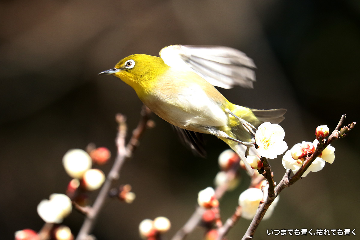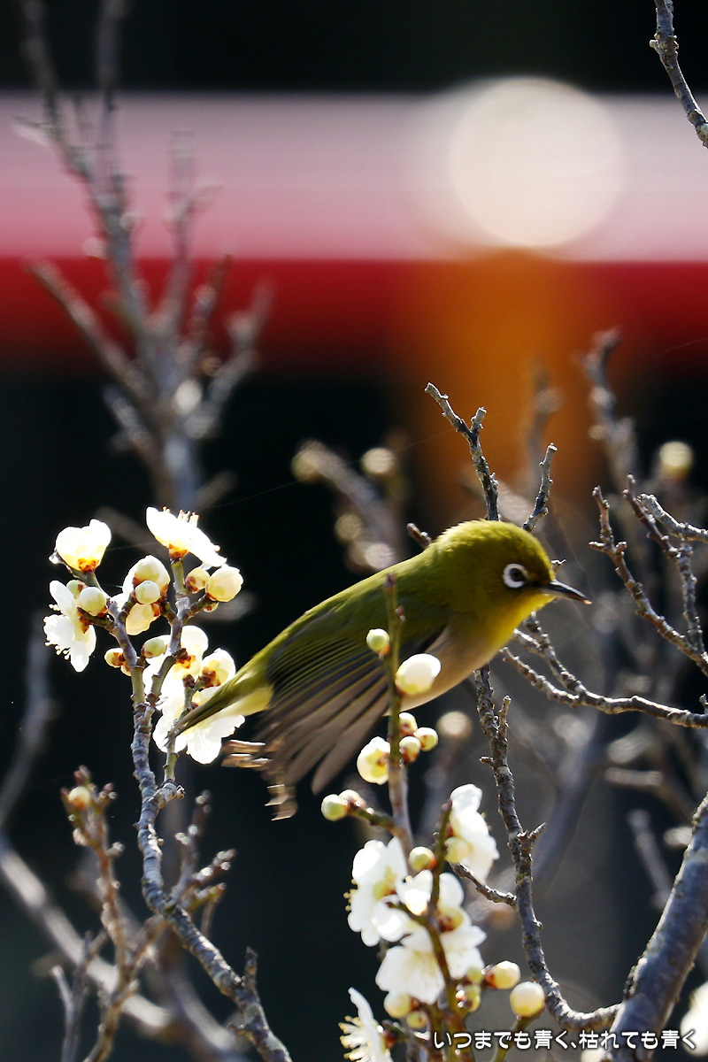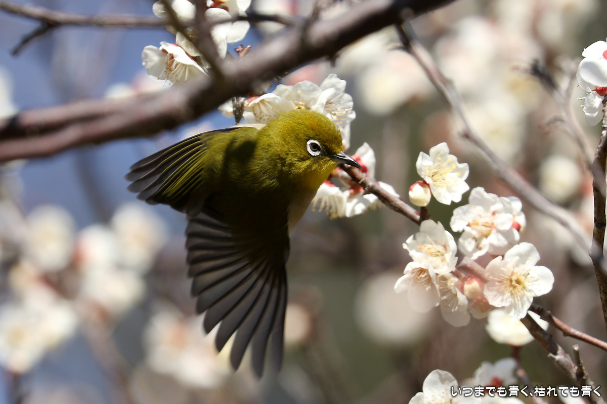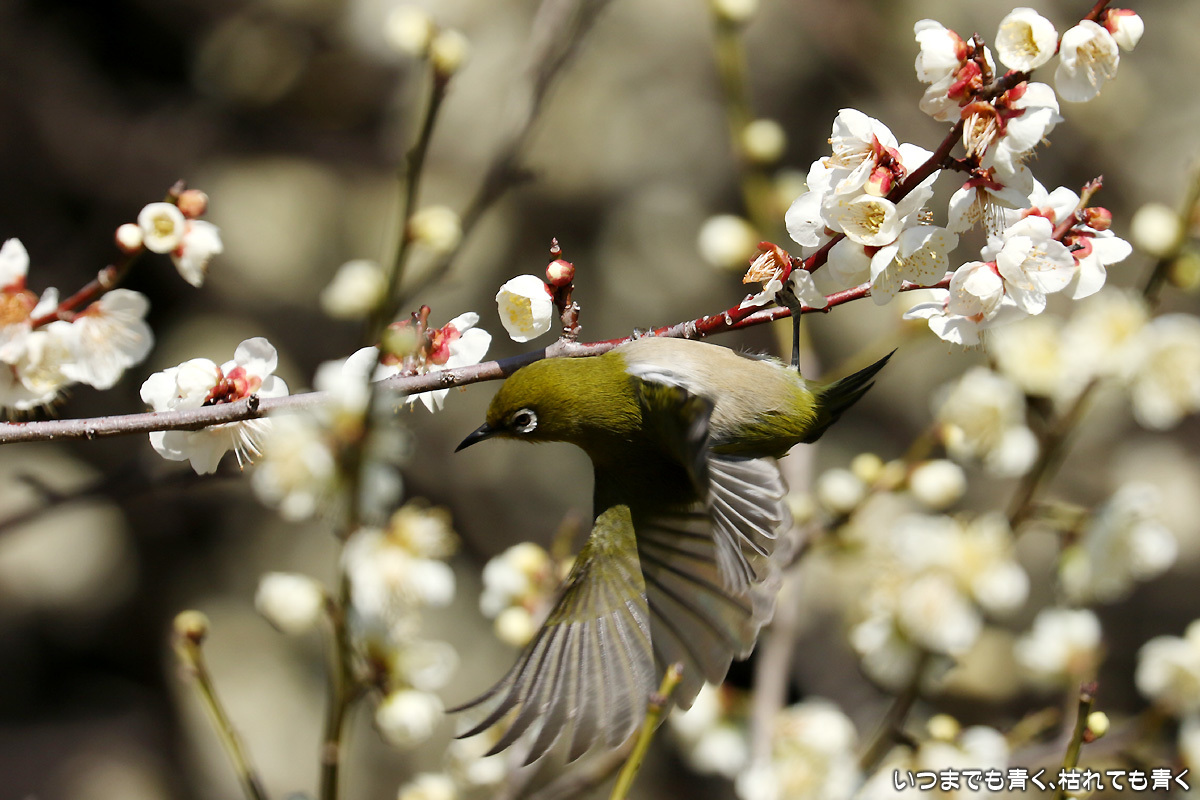 飛び立つ瞬間 ぶらりひとり旅 2017年3月3日(金) 23:59 今日は年休をとったので、また平芝梅林公園でメジロと戯れてきた。 メジロが飛び立つ瞬間の翼を広げる姿を狙ったが、狙って撮れるものじゃないな。 動きが素早く、高速連写でもファインダーの外に一コマで飛び出すし、ピントを合わせきれない。 梅の花も見ごろもそろそろ過ぎてきた。 今年のメジロとの共演も、そろそろ終わりかも。 【このエントリは、2017年3月4日に2017年3月3日付で掲載しました。】
