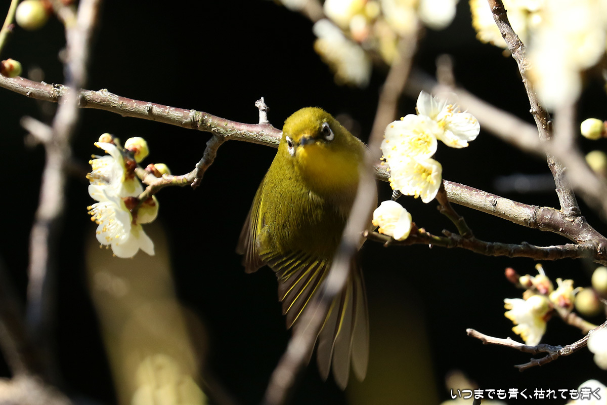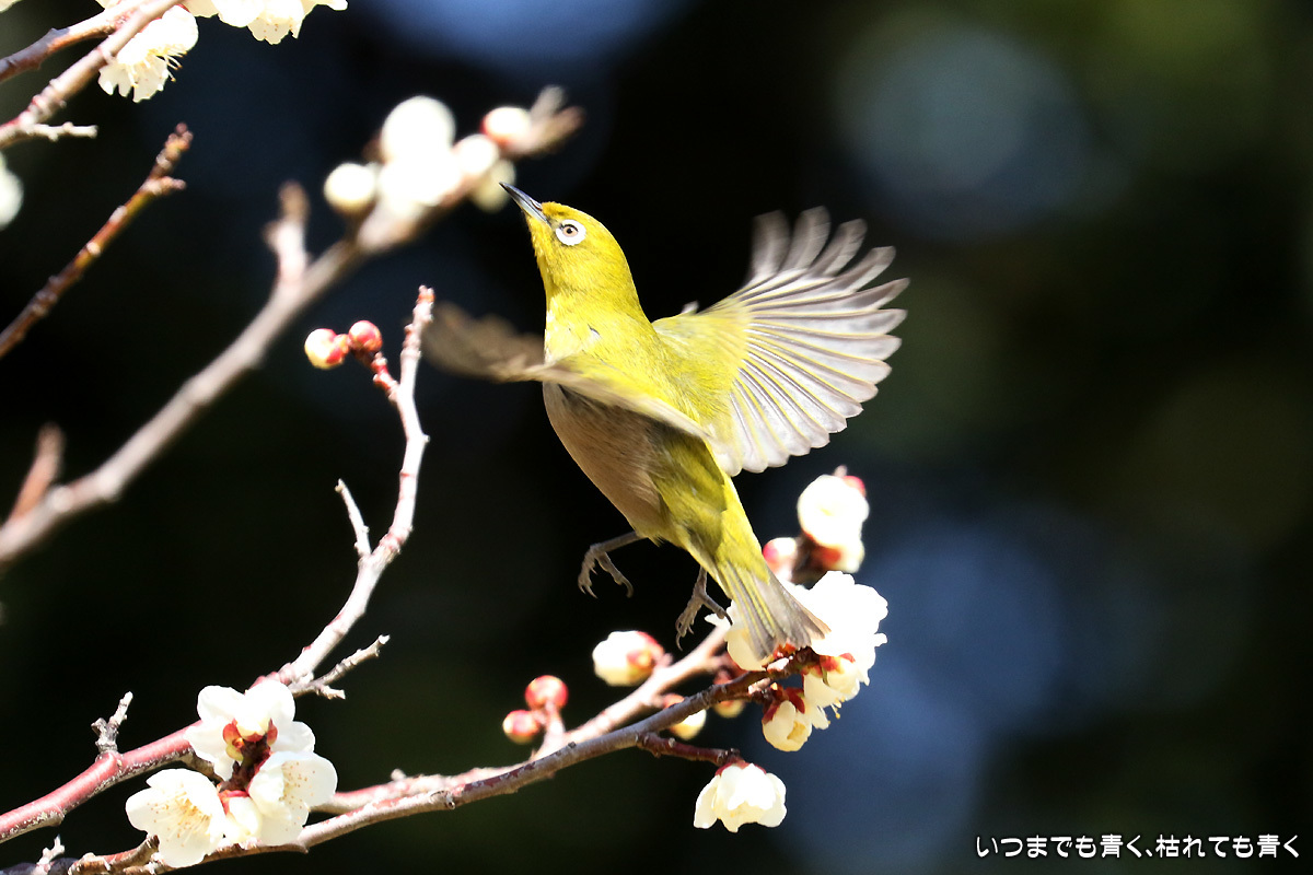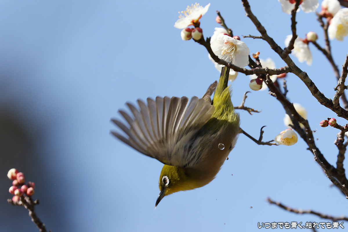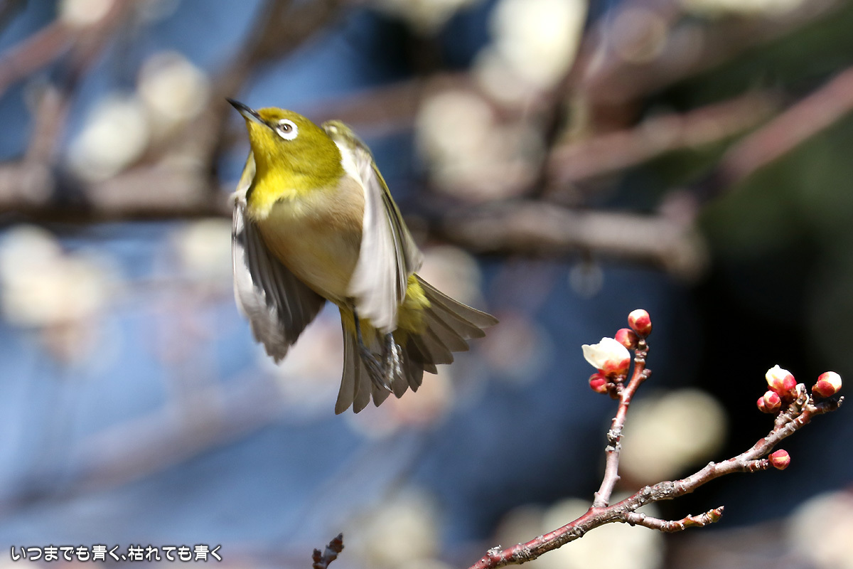 飛び立つ瞬間 ぶらりひとり旅 2017年3月3日(金) 23:59 今日は年休をとったので、また平芝梅林公園でメジロと戯れてきた。 メジロが飛び立つ瞬間の翼を広げる姿を狙ったが、狙って撮れるものじゃないな。 動きが素早く、高速連写でもファインダーの外に一コマで飛び出すし、ピントを合わせきれない。 梅の花も見ごろもそろそろ過ぎてきた。 今年のメジロとの共演も、そろそろ終わりかも。 【このエントリは、2017年3月4日に2017年3月3日付で掲載しました。】