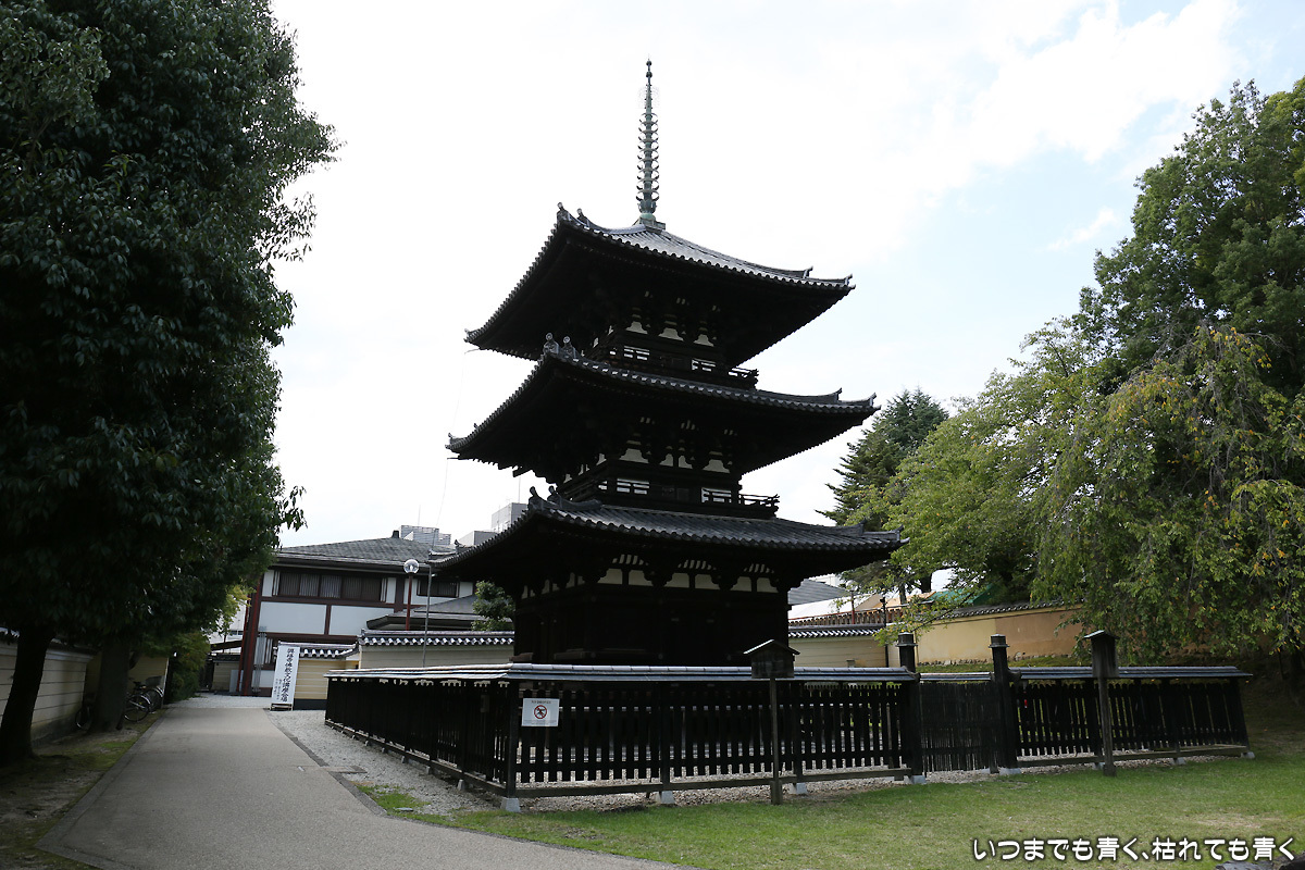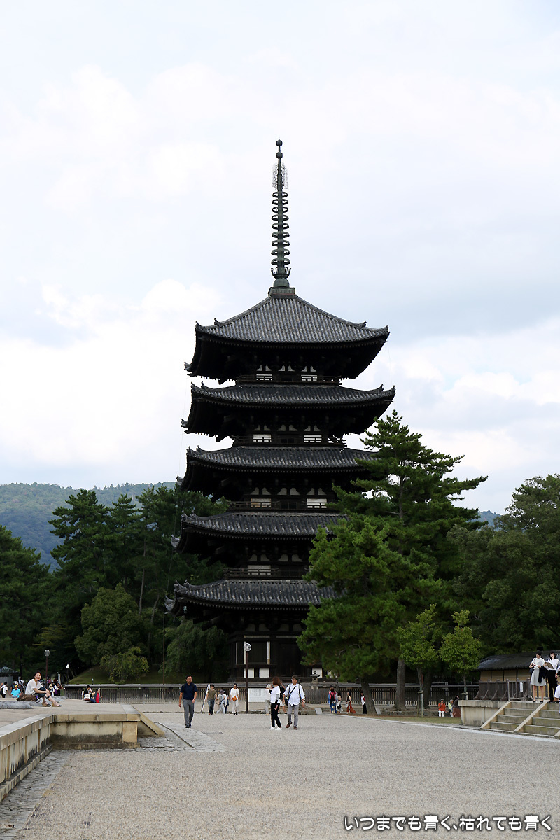 ![]() 南円堂から見た五重塔 | ![]() 荒池と五重塔 |