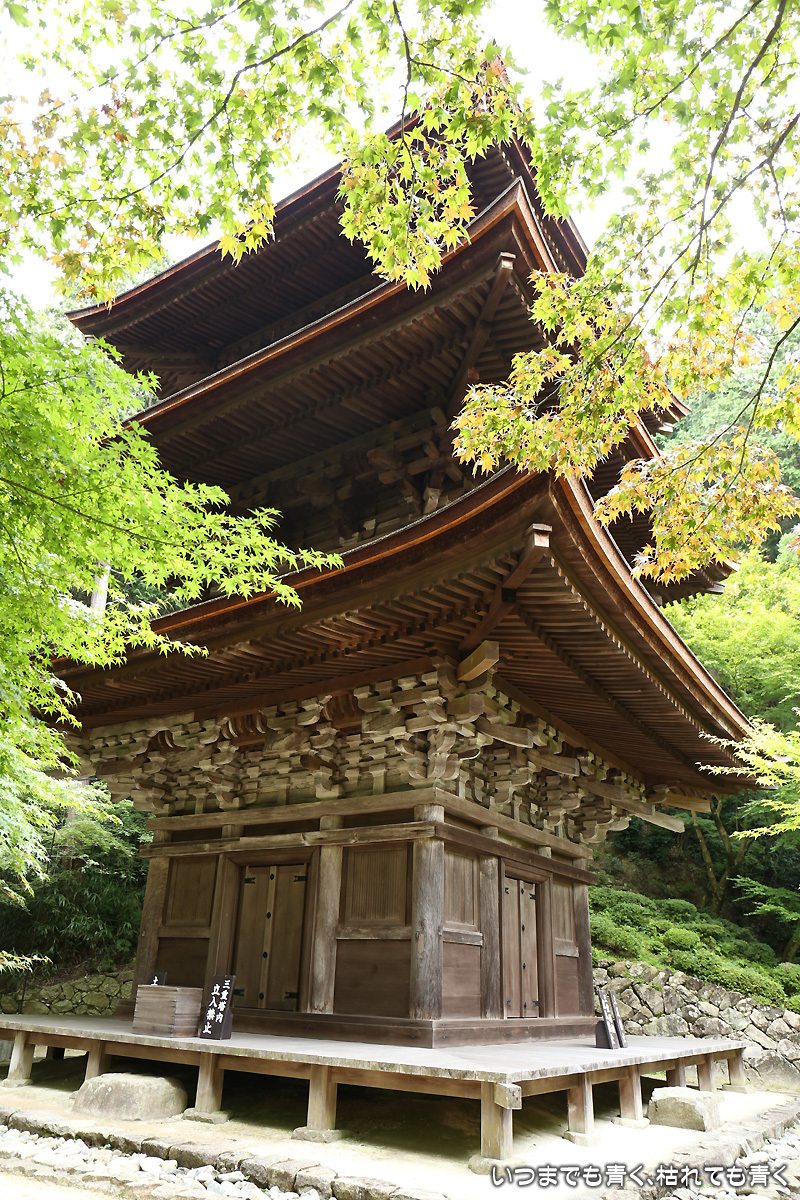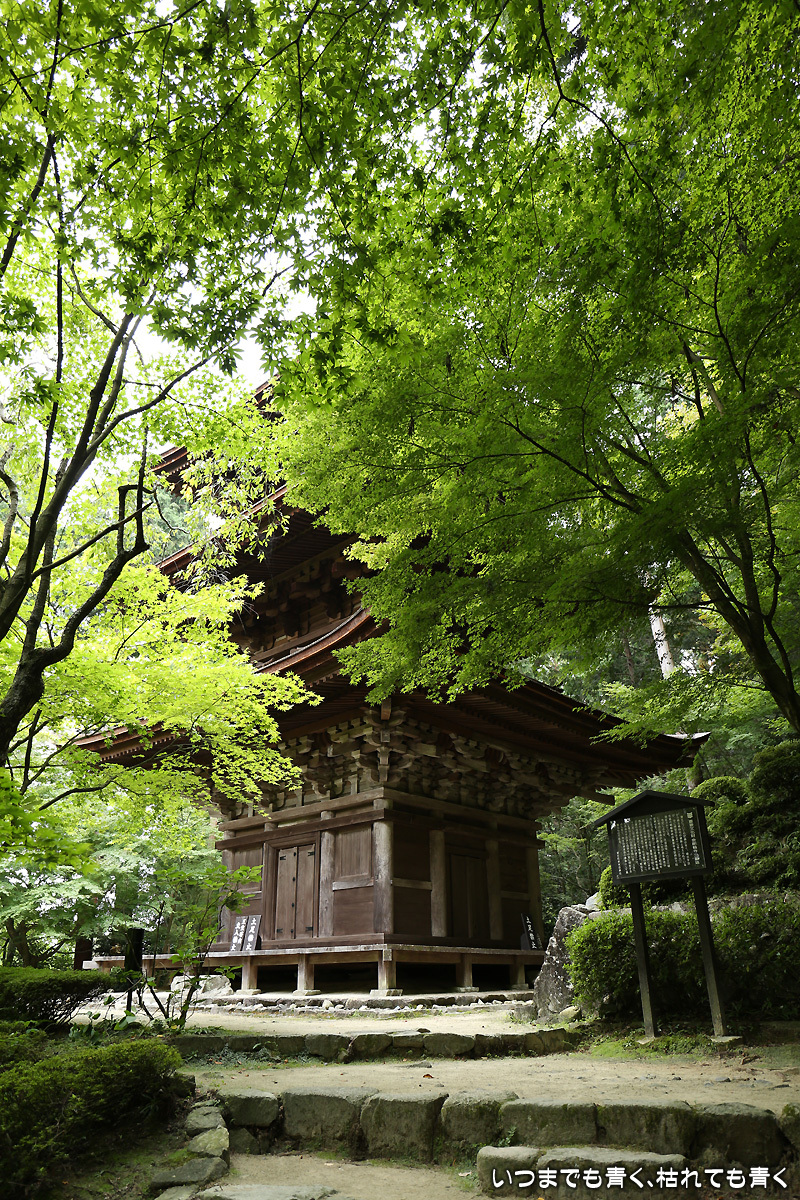 緩やかではあるが、坂道なのでけっこう体力を使う。でも、本堂に着くと緑のもみじにかこまれた二天門や本堂、三重塔の風景が心を落ち着かせてくれる。