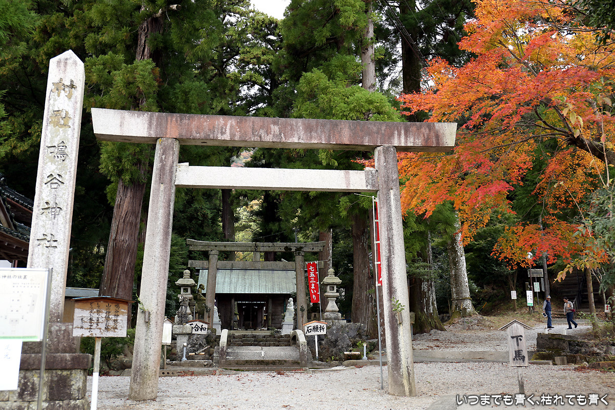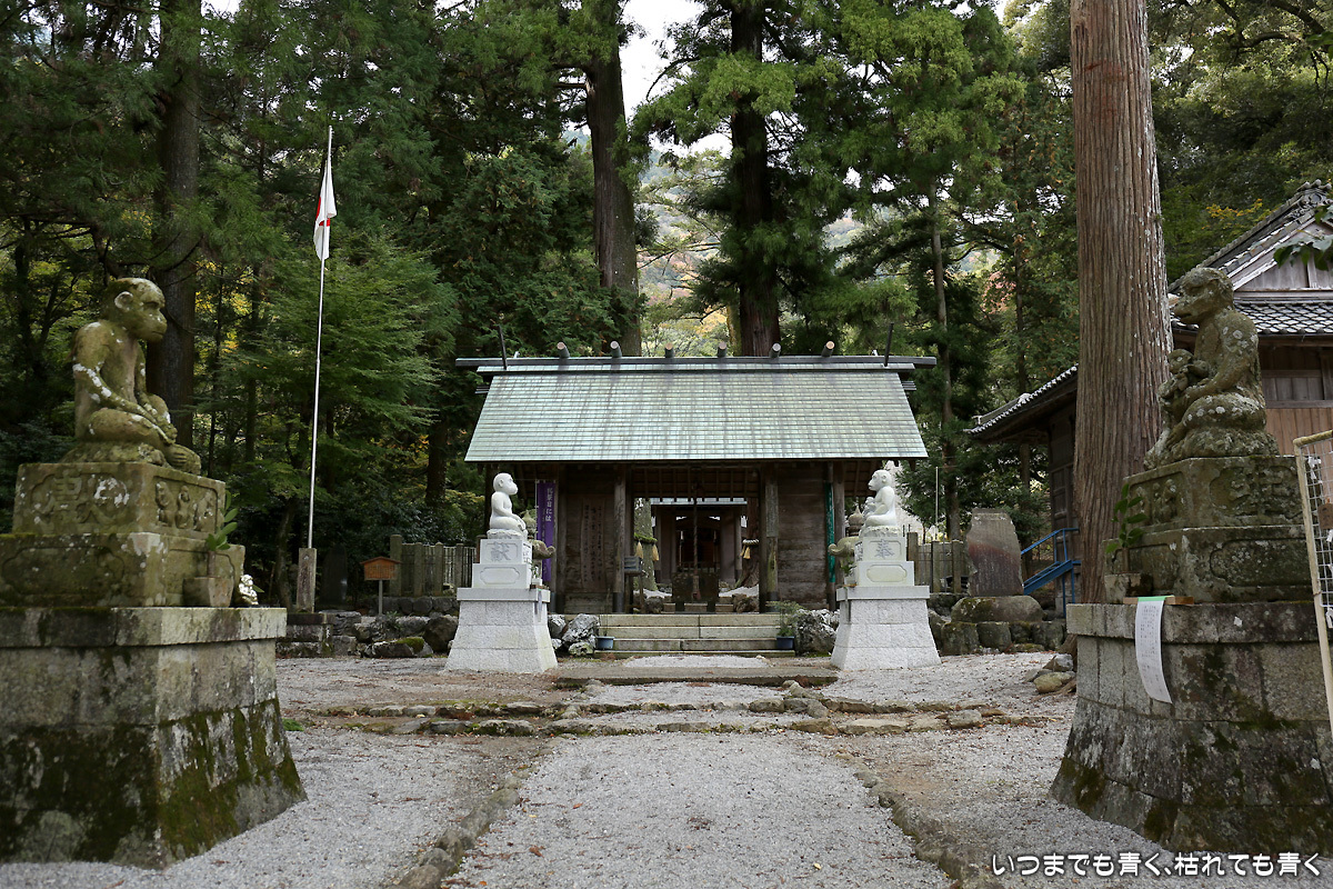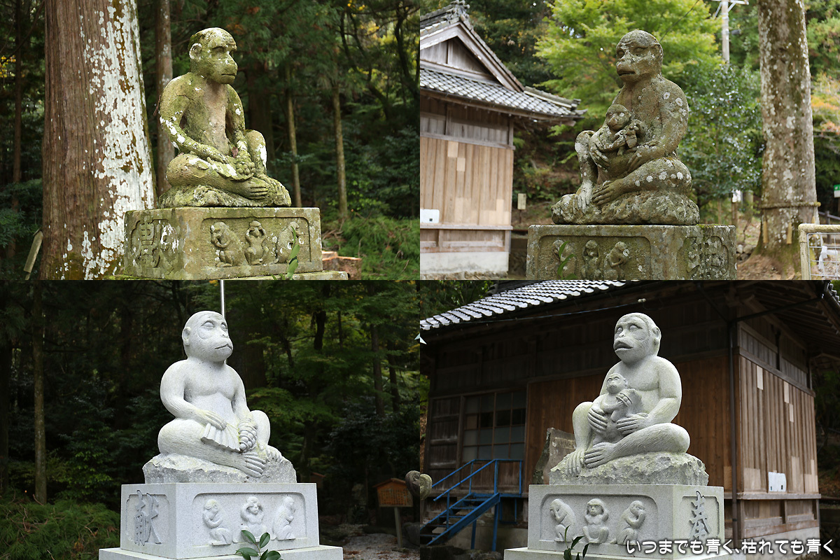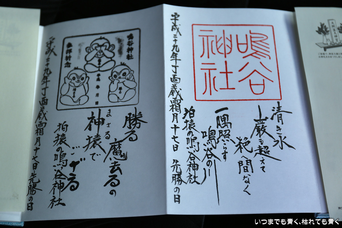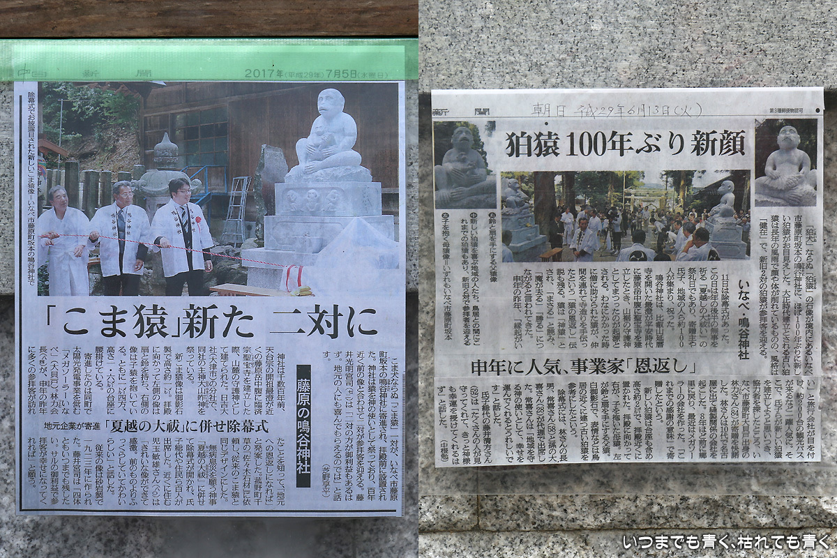 聖寶寺のご住職に、「石段を降りたところにある鳴谷神社の狛猿が有名なのでぜひ行ってみてください」と教えていただいたので、307段(数えた!)の石段を降りて登って(車は聖寶寺のそばにおいたので)参拝してきた。狛猿は古いのと新しいのと二対あって、たしかに珍しいし面白い。無人の社務所に宮司さんの電話番号が書いてあったので、電話をすると近くのご自宅に在宅ということで、珍しいご朱印も運よくいただけた。この御朱印はいただける機会は少ないらしい。