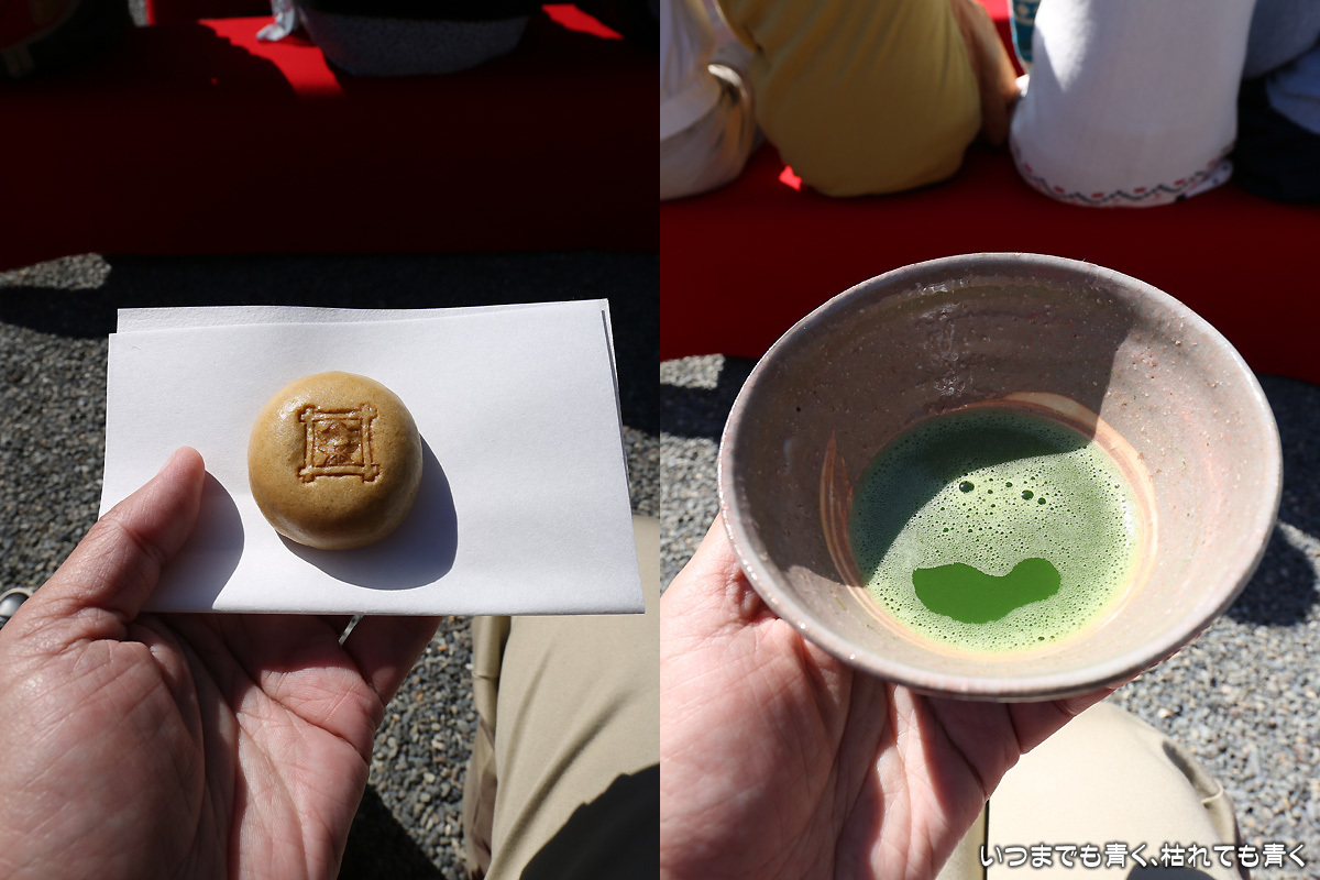 最後の2枚は、287段の苛酷な石段と、ちょうど開催されていた表千家同門会茶席で無料で振る舞われていたお茶とお菓子。