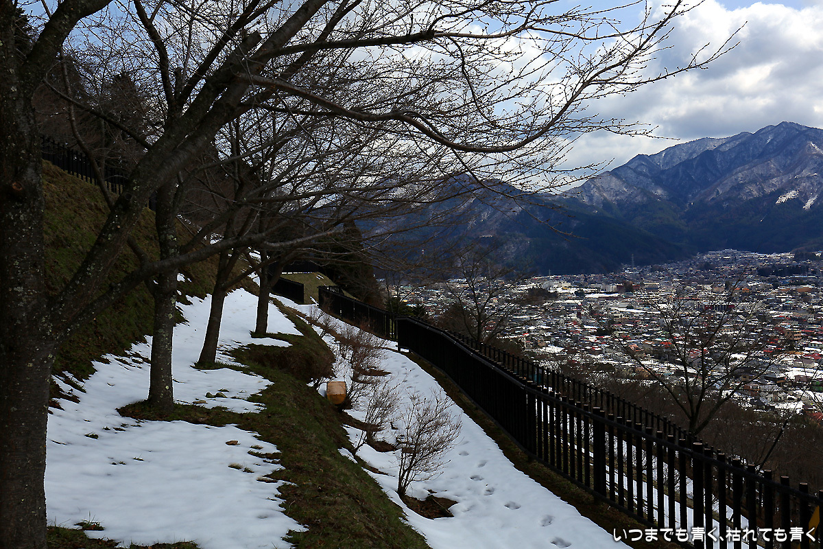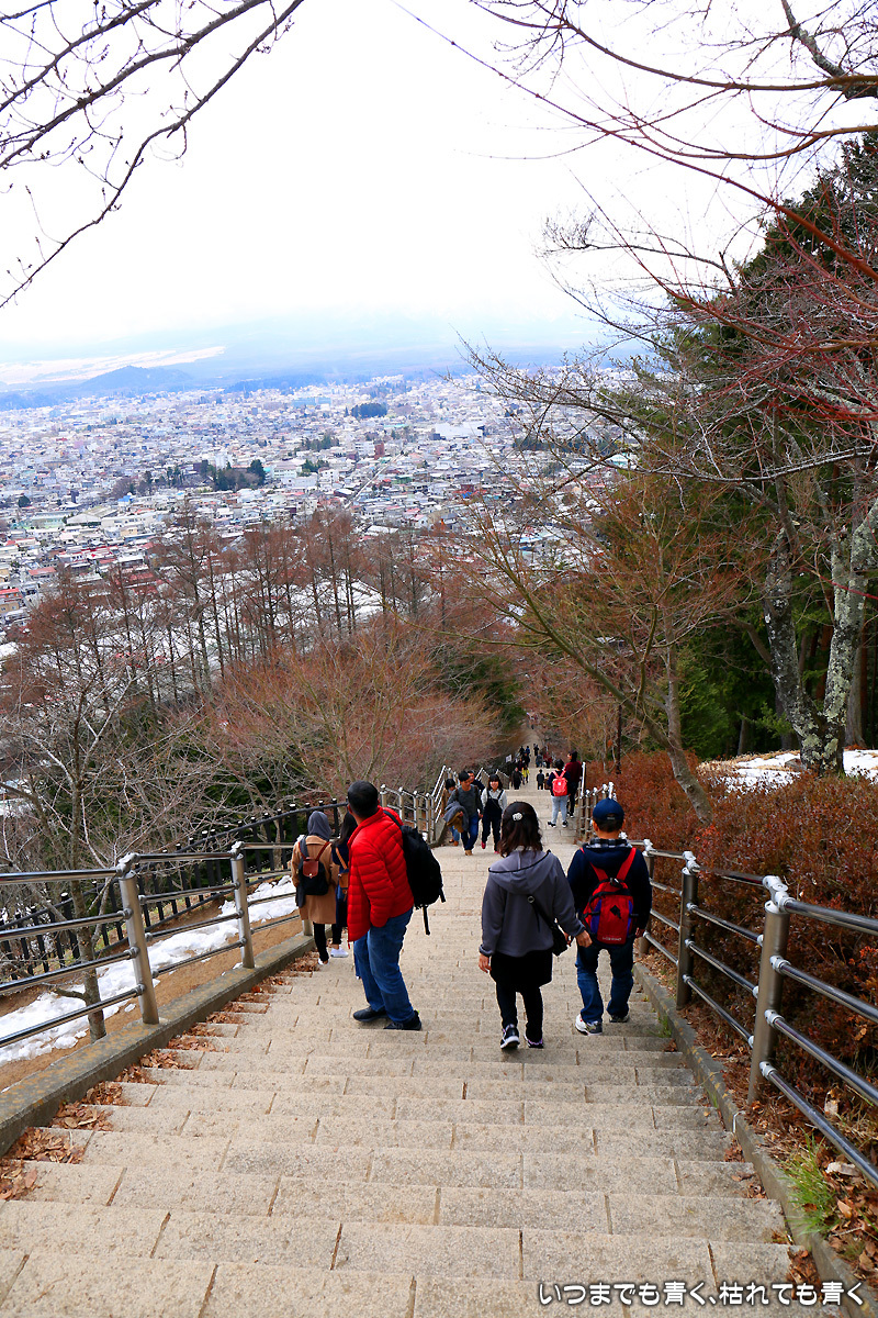 新倉浅間神社にお参りしてから、400段(メインだけで396段)近い長い石段を登って新倉浅間公園に来たけど、日頃のおこないの悪さからか、富士山はまったく見えず。桜の花もまだまだ先。