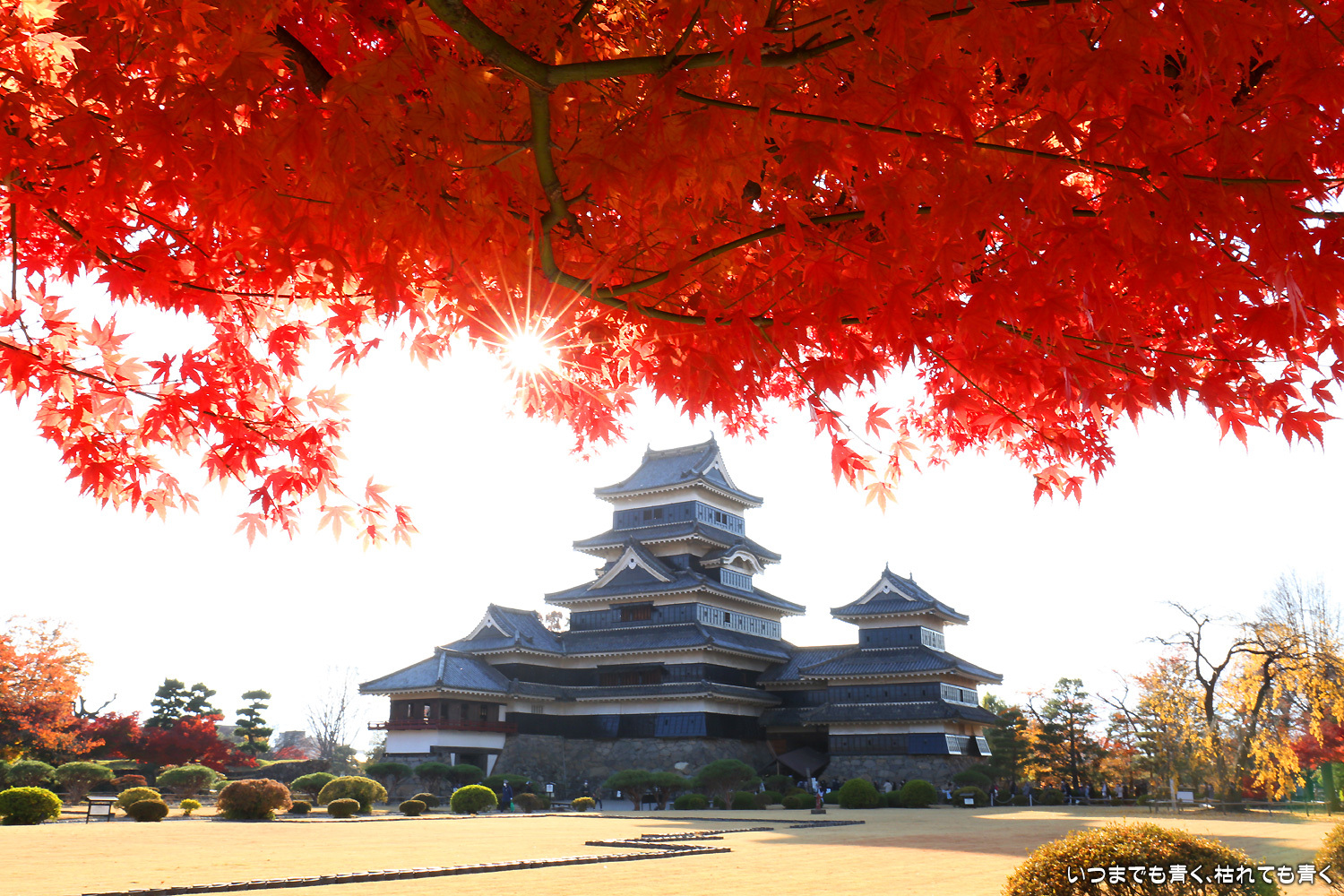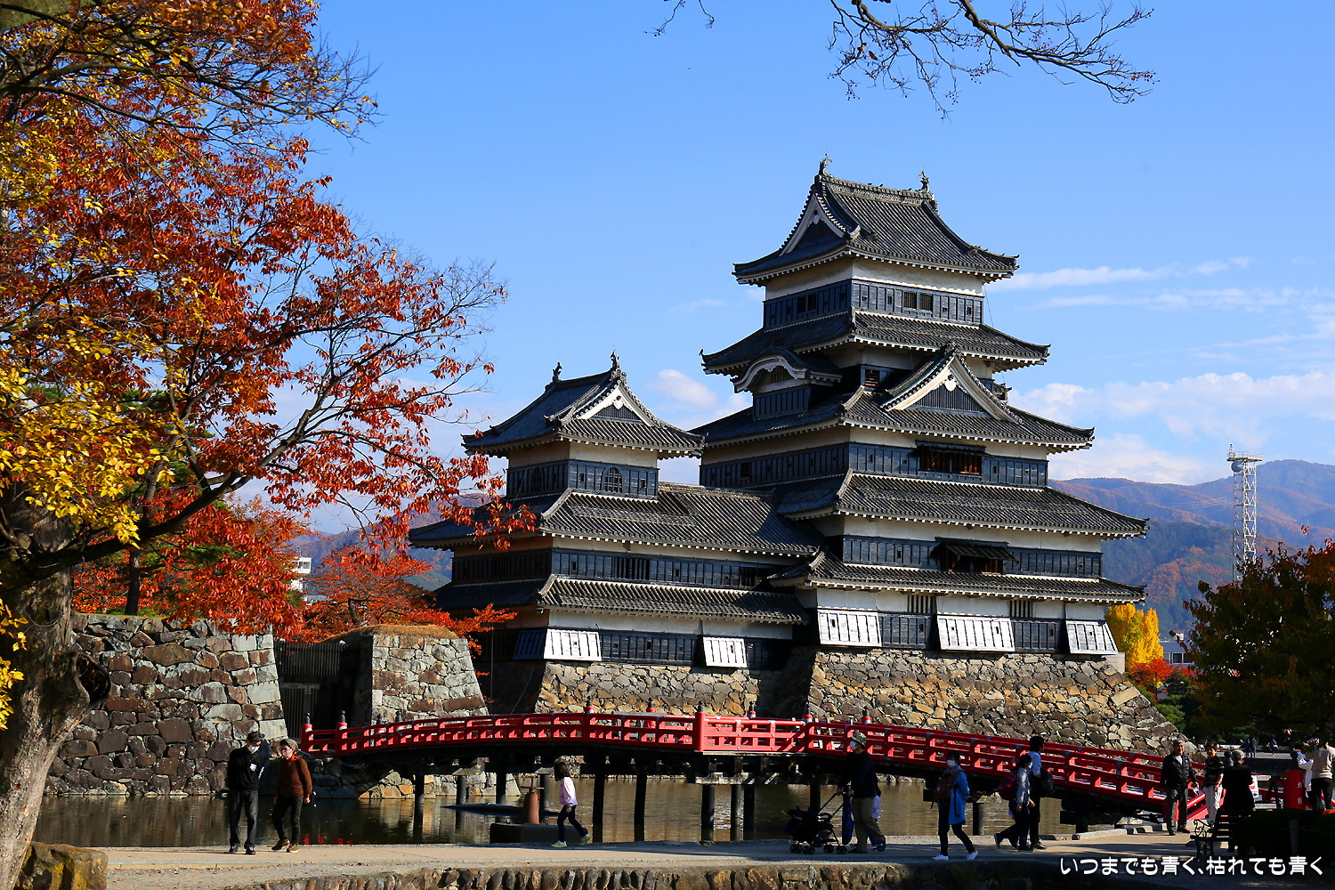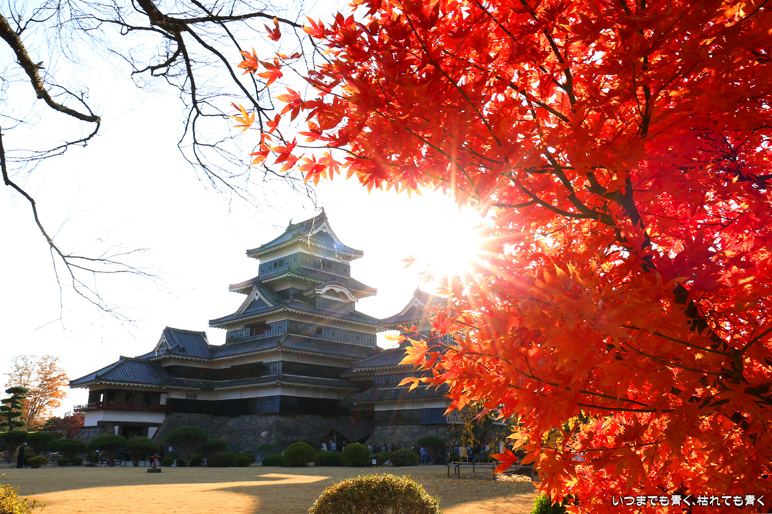 秋の松本城 その他ぶらり旅 2020年11月8日(日) 23:592023年11月28日(火) 7:45 家族で善光寺にお参りに行く途中に、天気もよく時間もあったので松本城に寄りました。 松本城は三度目ですが、いつも美しさに見とれてしまいます。背後のアルプスが白くくっきりと見えると最高なのですが、この時は霞んでぼんやりとしていたのがちょっと残念でした。紅葉はちょうど見頃で、真っ赤な紅葉と天守、そして逆光の太陽との撮影を楽しんでしまいました。