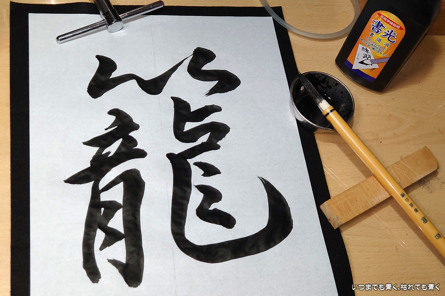 いつもはフォントなのですが、今年は何を思ったか100円ショップに行ったついでに筆、墨汁、下敷き、半紙を買ってきて、何十年ぶりかに筆を持って書いてみて画像に貼り付けました。さすがに硯までは買うのもどうかと思った(さすがに100円では買えません)ので塗料皿を使いましたが、たまには昔を思い出してやってみるのもいいかなと思ったりしました。