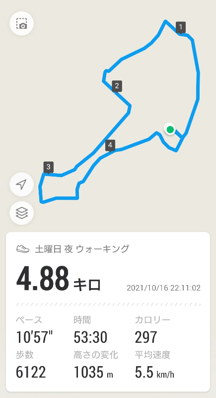 ウォーキング♯31 運動の話 2021年10月16日(土) 23:342024年7月3日(水) 7:52 ウェザーニュースの天気予報では、雨が降るのが午後10時から午前0時になったので、今日は中止のつもりだったウォーキングを急遽開始。しかし、22時半から小雨が降ったり止んだり。ウォーキングは歩き始めると雨であろうと歩きたくなるので、空模様を見ながら距離を稼いでいましたが、ちょうど家の近くで本降りになったので5km弱で仕方なく終了。この雨が過ぎたら気温は一気に下がるようです。