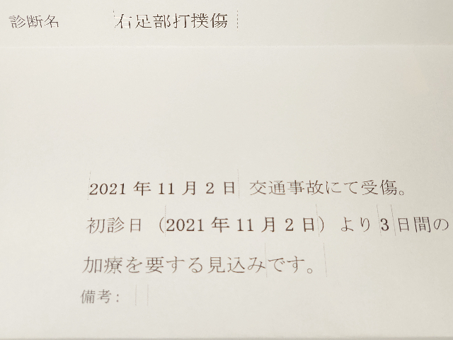 昨日、整形外科で診断書をもらい、そして今日は警察署で診断書の提出と被害者調書を書いてきました。車に足を踏まれて(250kg以上の重さがかかって)しばらくそのままになっていて骨に異常がなかったのは珍しいと会社でも病院でも警察でも言われました。骨密度はまだ大丈夫のようです。ちなみに被害者調書というのは、相手に処罰(減点などの行政処分等)を求める、求めないも記述します。加害者は同じ会社の従業員で、昨日上司が謝罪に来てくれましたし、会社が口を酸っぱくして言っている二段階停止と歩行者優先の基本行動ができていなかったということで、職場できつく絞られているようですので、処罰は求めないと書いてきました。交通事故には厳しい会社ですので、私も被害者とはいえ、防衛基本行動(車が止まらないかもしれないと思う危険予知)が足りなかった反省もありますので、上司と相談し職場にウォーキングでのヒヤリ体験として注意喚起をすることにしました。みなさん、交通事故には気を付けましょう。気を付けると言うことは、安全の基本行動を守ることです。