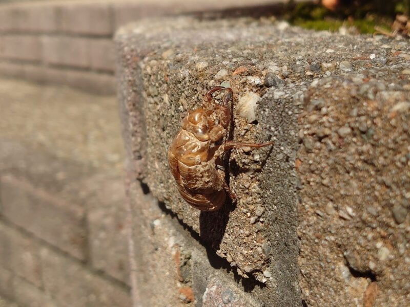 なぜこんなところで羽化?。どこからきたのでしょうか。それにしても暑い朝です。最高気温予想は39度。
