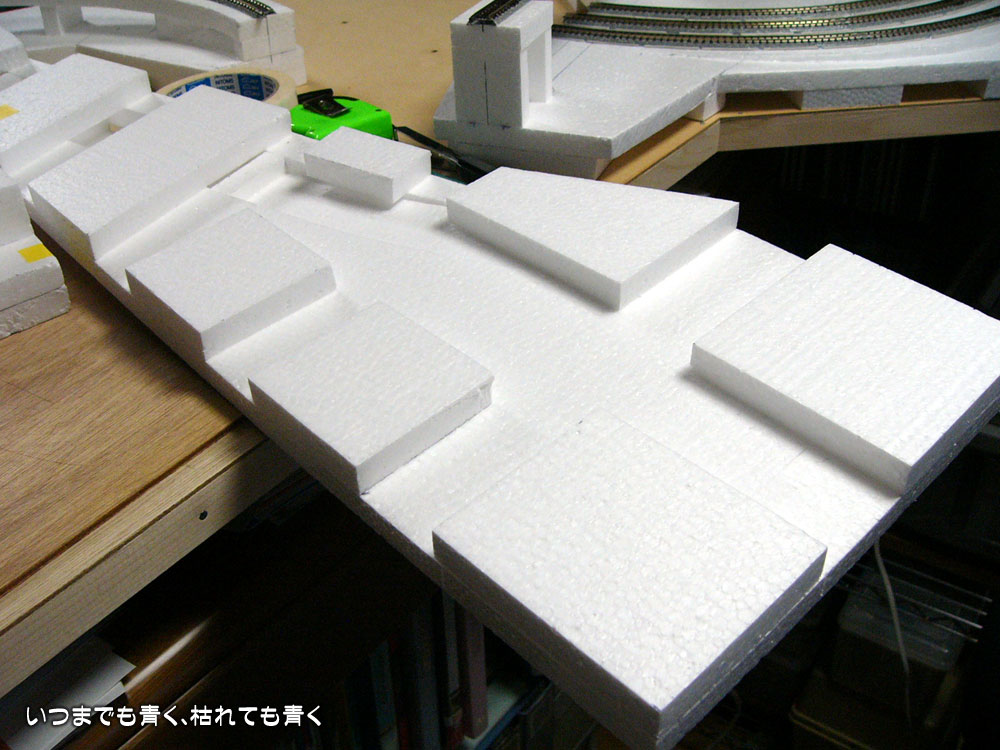 こうすると、高低差をいままでより15mm多くとることができますので、川(池?)の部分は、15mm厚発泡スチロール一枚分深くします。