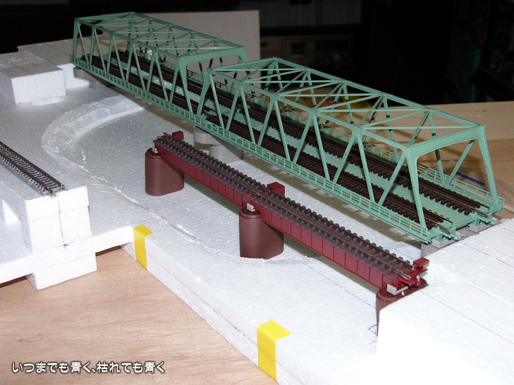 しばらく品切れだったデッキガーター橋を2個だけ入手できましたので、トラス鉄橋と並べて配置してみましたが、なかなか良い雰囲気です。こうして地形っぽい部分が織り込まれてくると景色がいきいきしてきます。