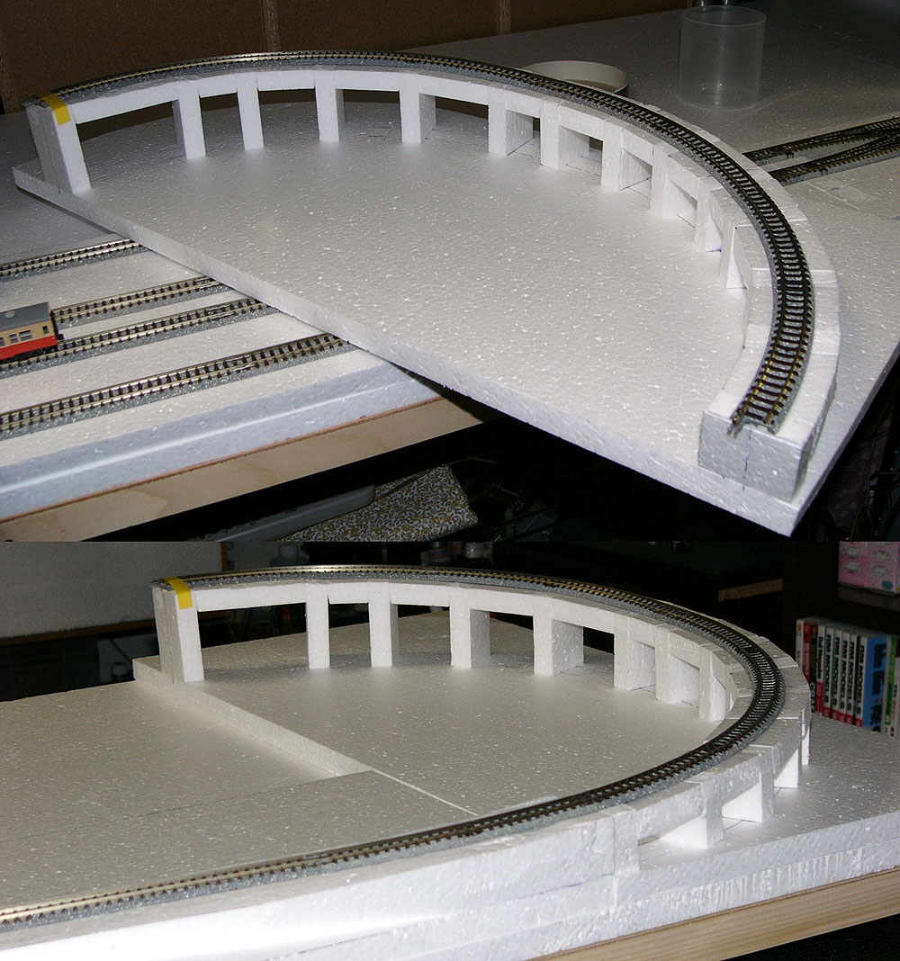 初代レイアウトでは、見えなくなる部分まで見栄えを気にしていましたが、今回はかなりいいかげんな現物あわせ。形もあまり気にしません。シーナリィを作りこむ段階でどうでもごまかせます。そこが車輌製作と違うところで、とにかく細かなことは気にせずに進めるというのが一番だと思います。