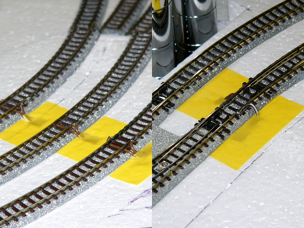 カーブ部分は内外差2mmのカントをつけてありますが、もう少しオーバーでもよかったかもしれません。でも、ここはリバースループに向かう連絡線でそれほど速度は出さない部分ですので、これでよしとします。