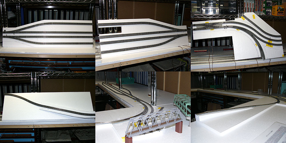 セクションの接続は、トミックスの線路のレールジョイナーとレールガイドだけになりますが、ファイントラックのレールガイドは確実な接続ができて、緩んでくることもありません。切り離しも自由自在です。勾配も発泡スチロールで作っていきます。