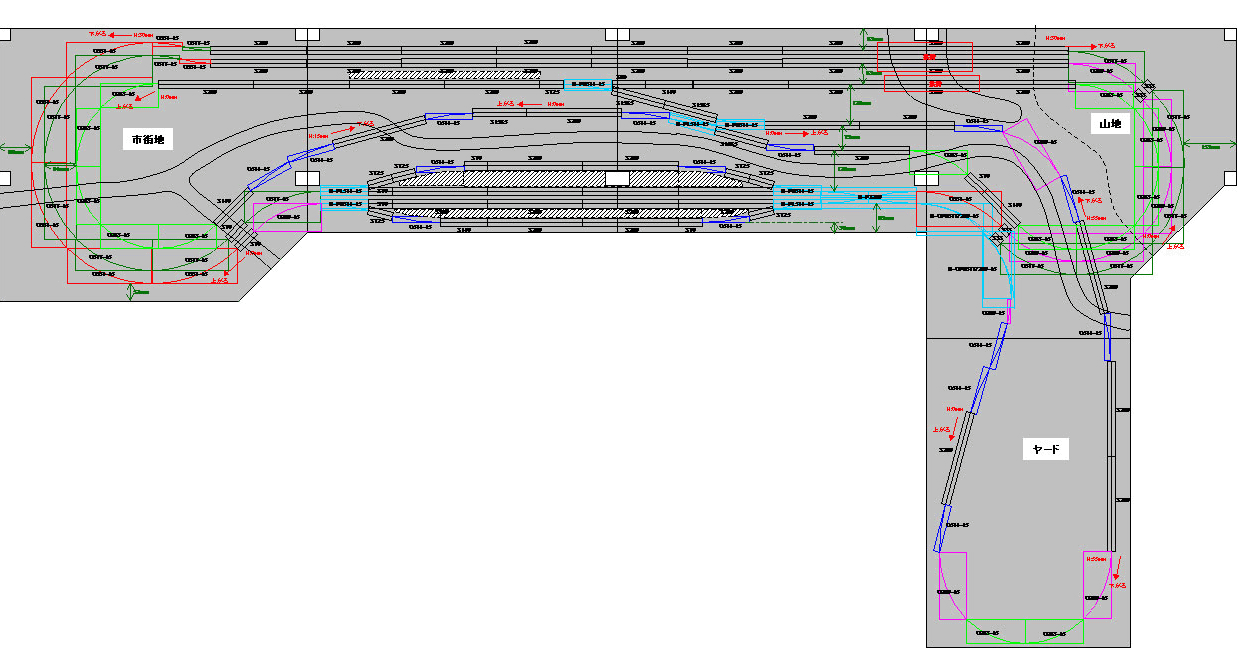 ごちゃごちゃしているように見えますが、実際にボード上に線路を置いて確認しながらなので、それほどではありません。でも、ストラクチャを置くスペースはかなりきついかも知れません。おおまかには、左手が市街地、右手が山となります。先代レイアウトの急勾配でのジェットコースター的な走りに興ざめしたところもありますので、今回は立体交差は最小限にし、無理な勾配はつけずに景色の変化のための緩やかな凹凸のみにします。