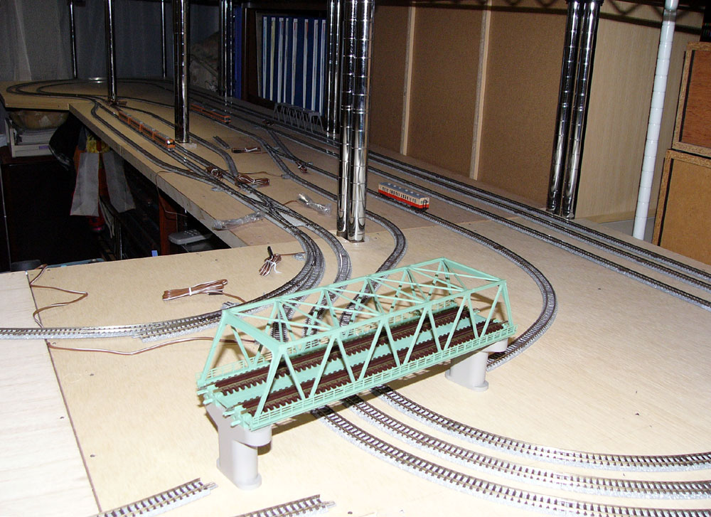 その作業が始まるとしばらく列車運転はできなくなりますので、もうしばらくこの状態で楽しもうかと思っています。その間に、電気配線も具体的に決めておくつもりですが、「3列車同時運転」と「ひとつの列車の同一電源での全線(複線、単線)乗り入れ」を実現するためには、少しややこしいこと(専用コントロールボードの製作)になるかも知れません。