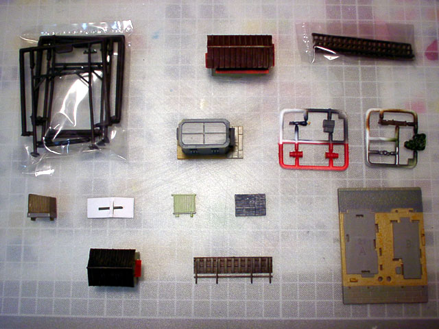 付属品のパーツは左の写真の通りです。左上の架線柱と右上の柵は、今回は使いません。今後のレイアウト製作の中で使うために、無くさないように保管です。