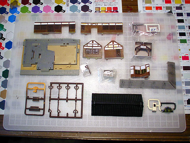 さて、キットですが、パーツは左の写真の通り。さほど多くないパーツ数で、色もプラの成形色ではなくきちんと塗装されています。その塗装も壁や屋根に適度なウェザリングが施されてあって、そのまま組んでも充分にリアルなものに仕上がる内容になっています。