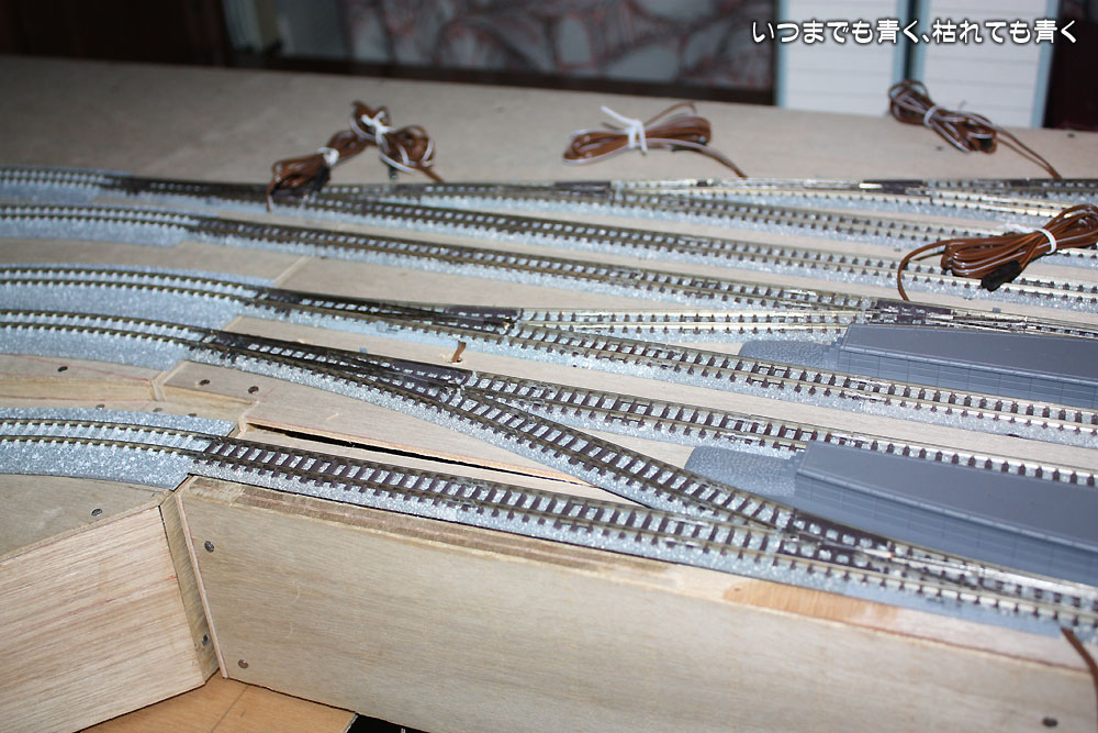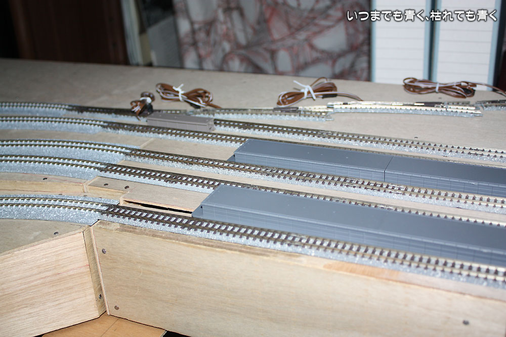 駅の左側(下り方面)に本線と支線をつなぐポイントを組み入れました。これで、本線からは本線にも支線にも入れますし、支線からは本線に出ることができます。ホームの有効長は直線部分で13~14輌といったところでしょうか。上り側のカーブ部分へ少しホームを延長させることで15輌分の長さの確保を考えていきます。