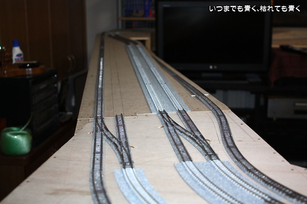 高架部分とヤード部分を残して、線路の仮敷設が終わりました。