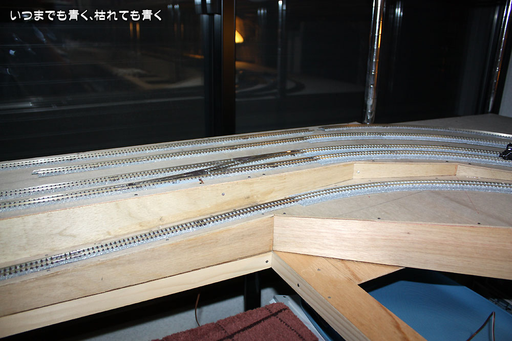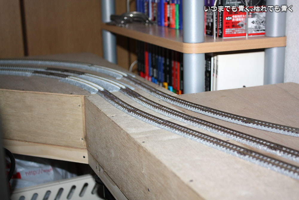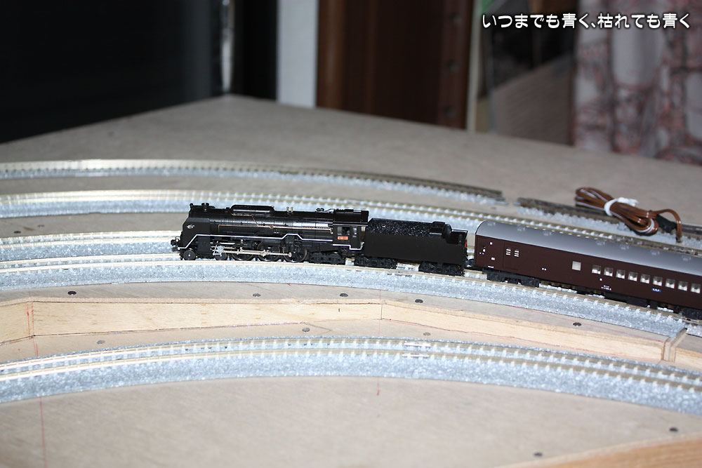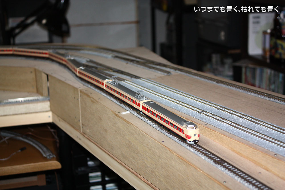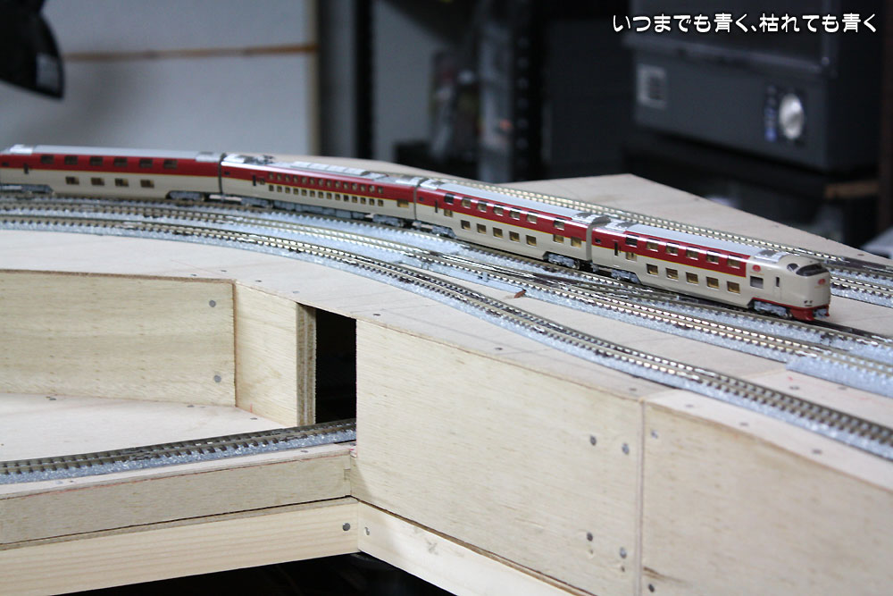 ベースボードの接続部分の段差や勾配のテスト、電気配線の確認、ポイント動作の確認を行って、問題が無ければ正式に線路を固定する作業に進みたいと思いますが、しばらくはいろんな車輌を走らせてチェックを兼ねて楽しみたいと思います。正式に線路を固定する場合は、下にコルクボードを貼るつもりでいますが、その作業はまだまだ先のことです。