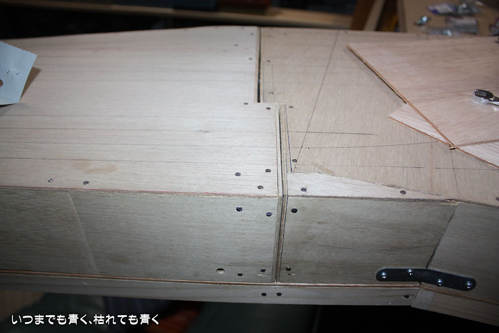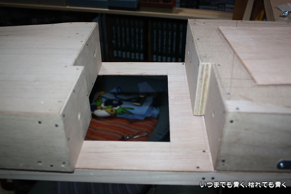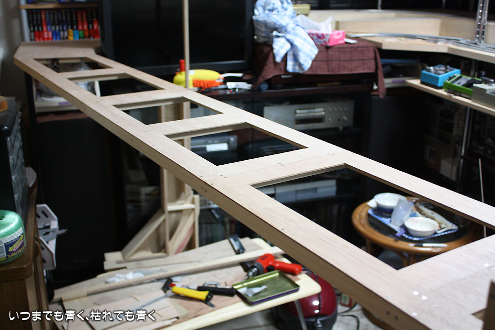 ベースボード接合方法変更 レイアウト製作 2010年9月10日(金) 23:592023年11月30日(木) 1:13 ベースボード製作も佳境にはいってきましたので、こまめに掲載することにします。 ベースボードをのせるベースパネルの穴あけを昨日に引き続き実施していきます。とりあえず、駅の反対側の直線区間の部分の開口は完了しました。 この直線部分のベースボードも完成に近づけておきます。 設置してみると、トンネル(地下)部分は裏からでも保守困難だとわかりましたので、横の部分を開口します。最終的な処理は後々考えることにして、大きい目にあける部分のケガキをします。 開口しました。こういう板のくりぬきですが、これは実はノコギリ一本でやっています。案外きれいに抜けるものです。 設置してみるとこんな感じです。シェルターっぽく処理できそうですね。なかなかいい感じかもしれません。 昨夜、接合部の処理を紹介しましたが、アルミL字金具の厚さの分だけベースボードが浮くのが気に入らなくて、方法を変更しました。やってみて決めるというやり方ですので、こういうことはよくあります。 オーソドックスにボルトで固定するという方法にしました。ボルトは6mmを使用、片側にはツメ付きナットを固定します。 接合するとこんな感じになります。ベースボードを浮かすことなく裏から簡単にボルトを入れる事ができますし、固定後もけっこうしっかりした感じになります。ただ、ボルト穴の両側の位置決めが微妙で精度を要します。 裏からみるとこんな感じになります。メインテナンスも作業もしやすい感じで、ベースボード設置後にベースボードを取り外したりひっくり返したりする必要はなさそうです。 まだまだ木工作業が続きます。