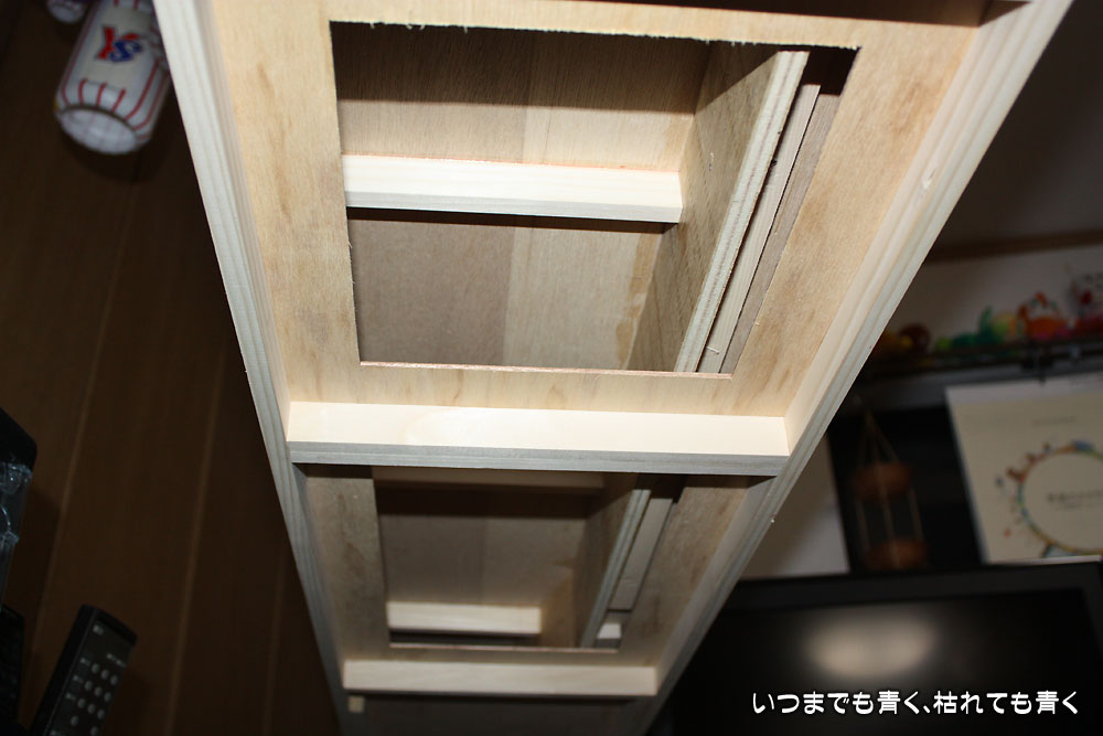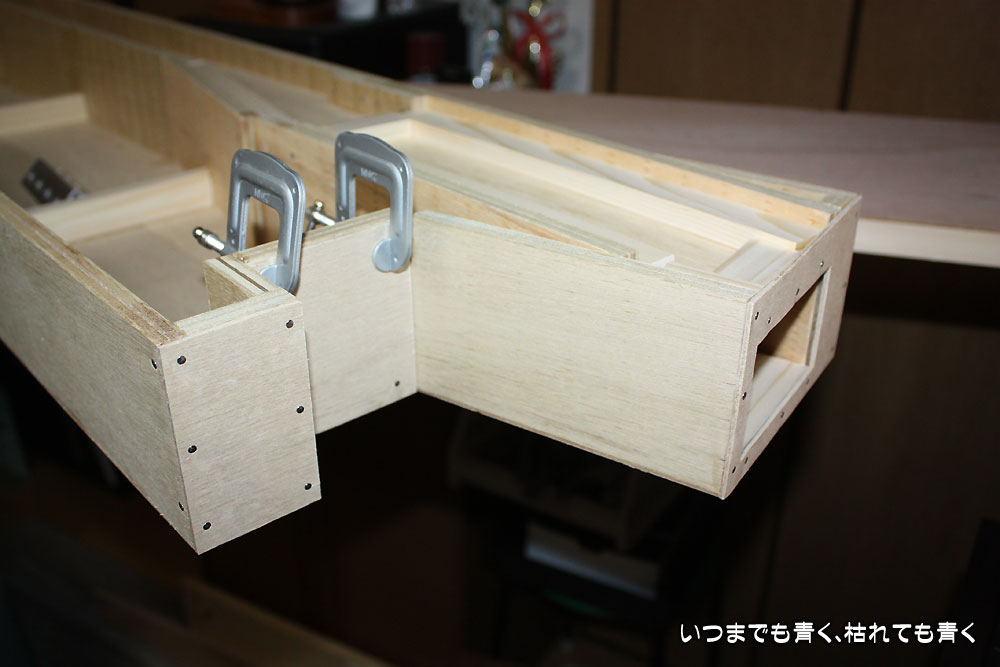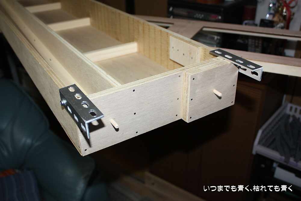 セクションとセクションの接合部分は、接合面をきれいにするために2mm厚(正確には2.3mm厚)のベニヤ板を貼り付けます。もちろん、そのために接合面は4~5mmほど間隔をあけて寸法を決めてあります。