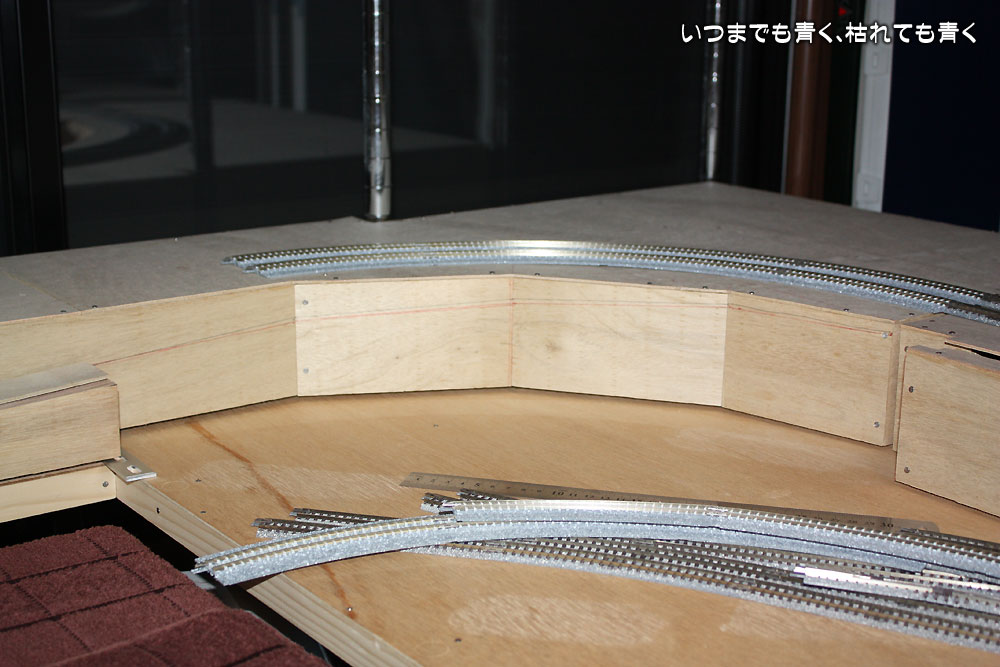一昨日に作業を終えてボンドの乾燥を待っていた、今回のレイアウトでの唯一の本線曲線勾配区間です。走行上問題ないかどうかは走らせてみないとなんともいえませんが、数値的には556mm(R354の90度)の距離で30mmの勾配で5.4%の勾配となります。Nゲージでは、3%くらいが問題ない勾配と聞いていますので、かなり急勾配の部類になってしまいます。この段階で一度テストをしておきたいと思っています。ただ、複線の下り勾配となる部分ですので加速がついてしまうことはあっても走行不可という問題にはならないのですけどね。
