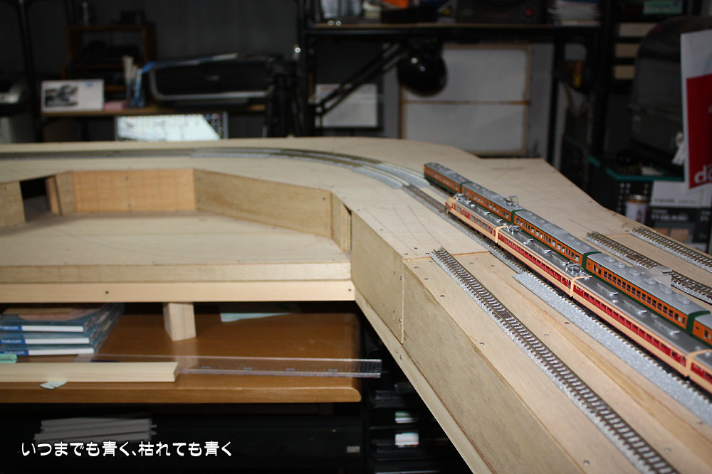 線路を仮敷設して走らせています。セクションベースボードをしっかりと接合していませんので、接合部分が盛り上がったりしていますが、平面部分の走行はまったく問題ありません。問題は勾配部分なのですが、その部分はまだ線路の仮敷設ができません。