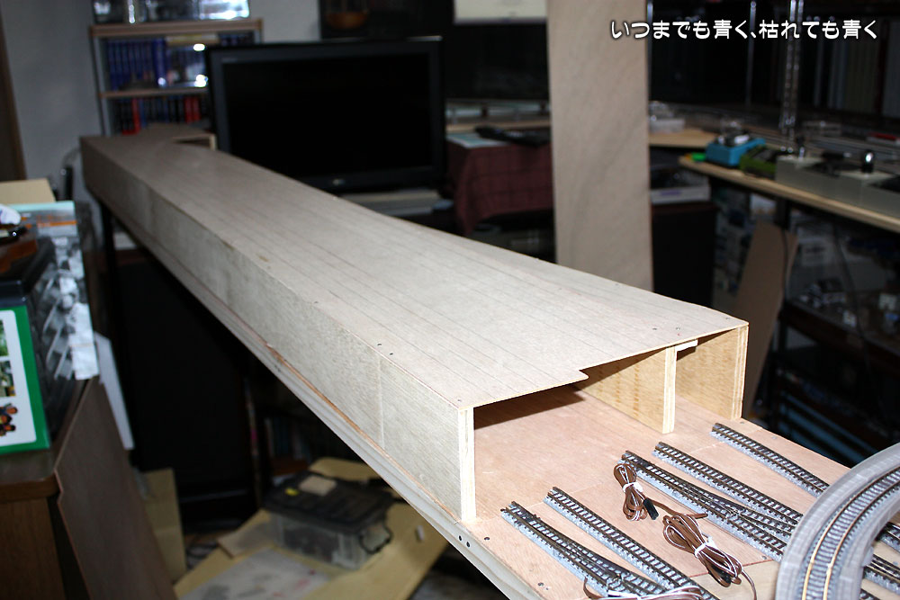 線路配置がどうにか決まって線路を仮置きして試走させたりしていましたが、情景を作るベースボードをどうするかずっと悩み続けていました。最初にやったように発泡スチロールで作るかきちんと木でつくるか、そしてセクション(今までモジュールと言っていましたが、規格化された構成単位ではありませんのでセクションと呼ぶことにします。)分けをどうするか、など・・・。