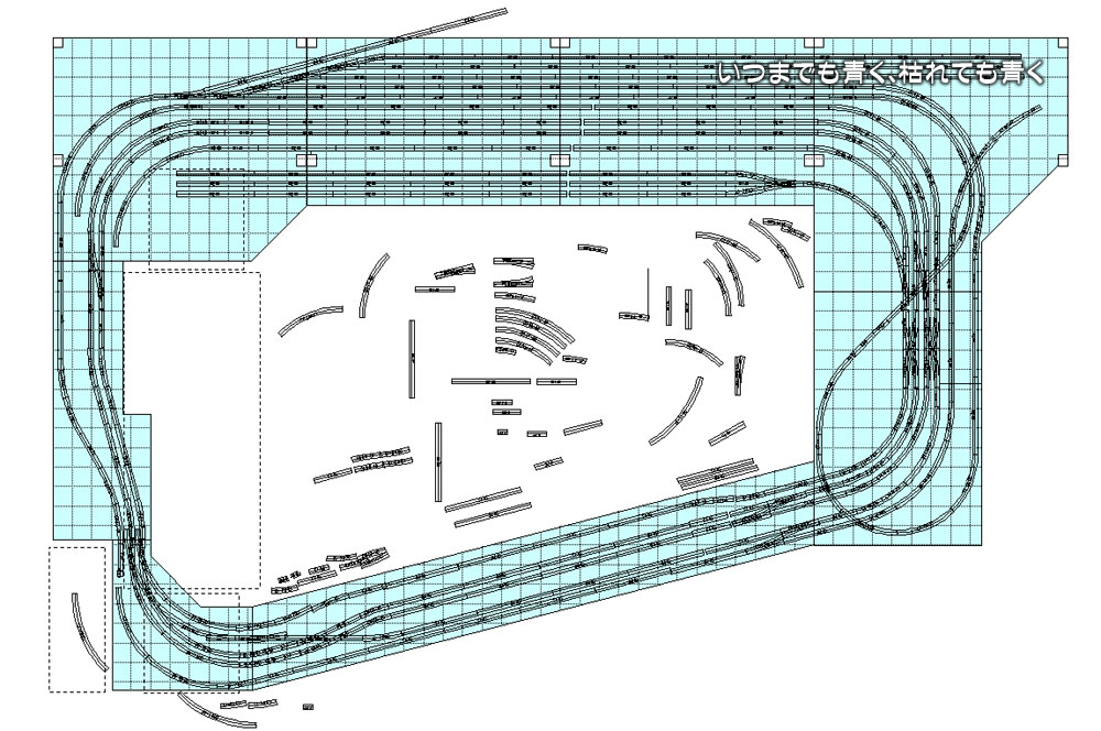 まだまだ途中段階で、考えるべきところはたくさんありますが、基本は複線ループがふたつで複々線とします。駅は複々線の同方向同ホームとし、乗り換え、追い越しを可能とします。ヤードは出来る限り確保し、リバース線も専用で確保します。ヤードへの引込み線もぐるっと一回りさせて、複々線プラス単線の5線となります。