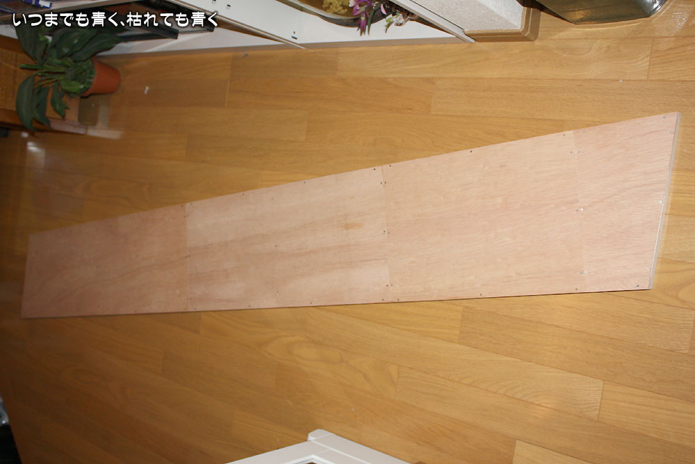 出来上がったものが下の写真。はり付けたベニヤ板の大きさが統一されていないのは、手持ちのベニヤ板を効率よく使い切ったためです。