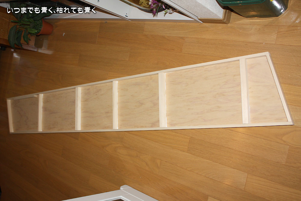 耳の調子が少し良くなって元気が出てくると、何か身体を動かしていないと落ち着かない私。早速、残っていた橋渡しの部分のボードを製作しました。設計図から寸法角度を割り出して、その寸法で枠を作りベニヤ板をはり付けていきます。サイズが大きいのでねじれないように、広い玄関の床で平らになっているかをチェックしながらの製作でした。