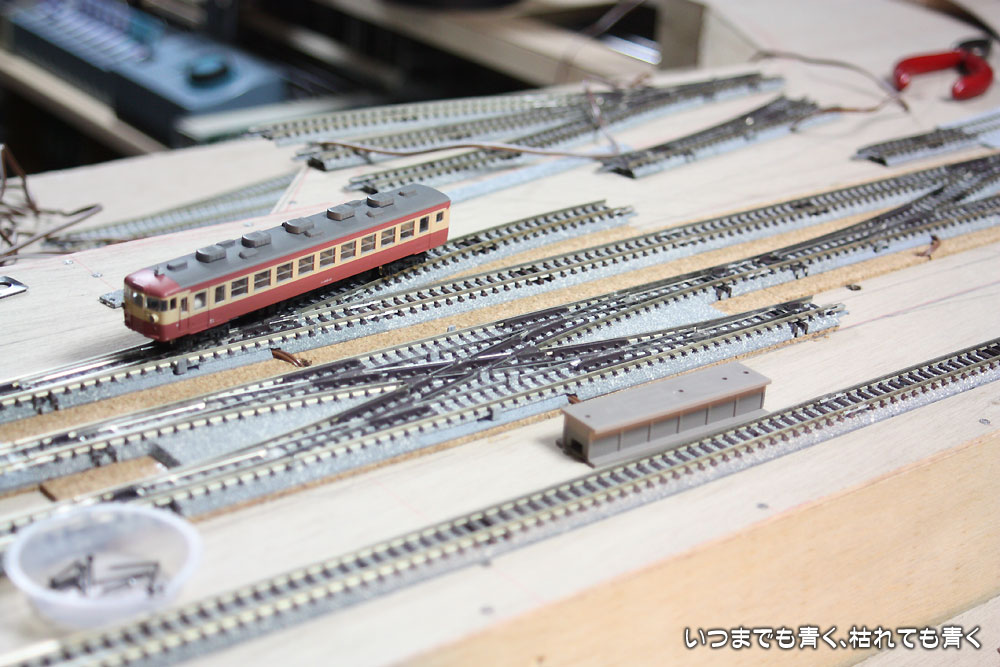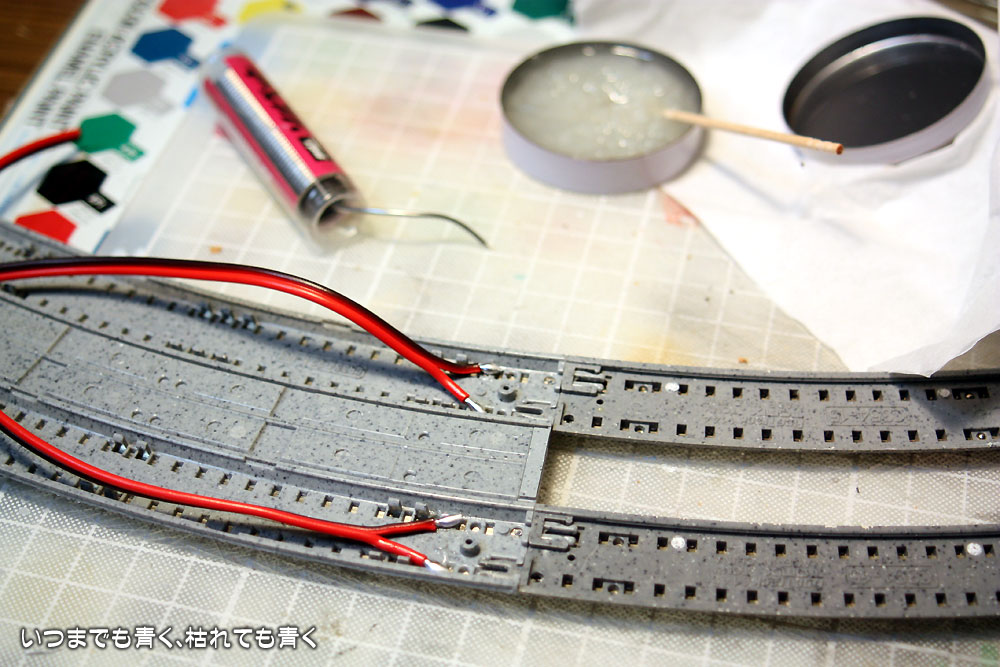 ![]() フィーダーにはギボシ端子を取り付け | ![]() 線路固定中 |