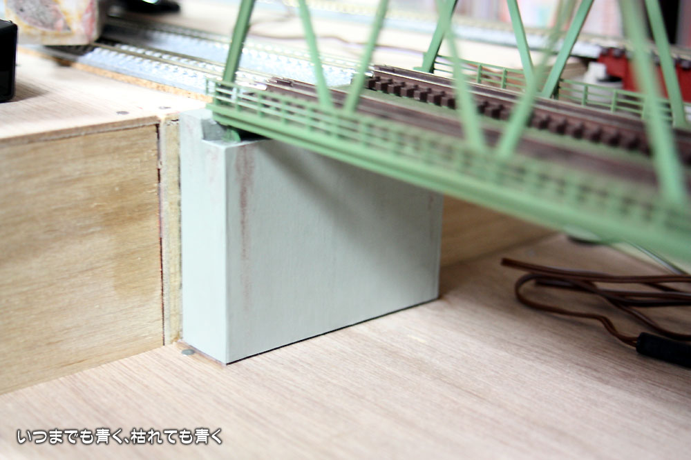 複線トラス鉄橋を設置 レイアウト製作 2011年3月5日(土) 23:202023年11月30日(木) 0:53 先週から製作し始めた複線トラス鉄橋の橋脚ですが、やっと完成し、レイアウトに固定設置しました。ウェザリングは苦手なのですが、汚しちゃえばいいやという感覚で適当にやってみましたがいかがなものでしょうか? 両端は自作、中央は付属橋脚を嵩上げ サーフェサーを塗ります グレーで塗装したあとウェザリングを少々 レイアウトに設置 そんなに不自然でもなさそう・・・ こちらもまぁまぁ良しとします