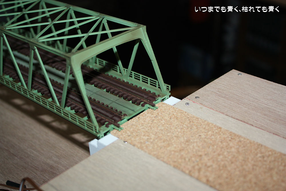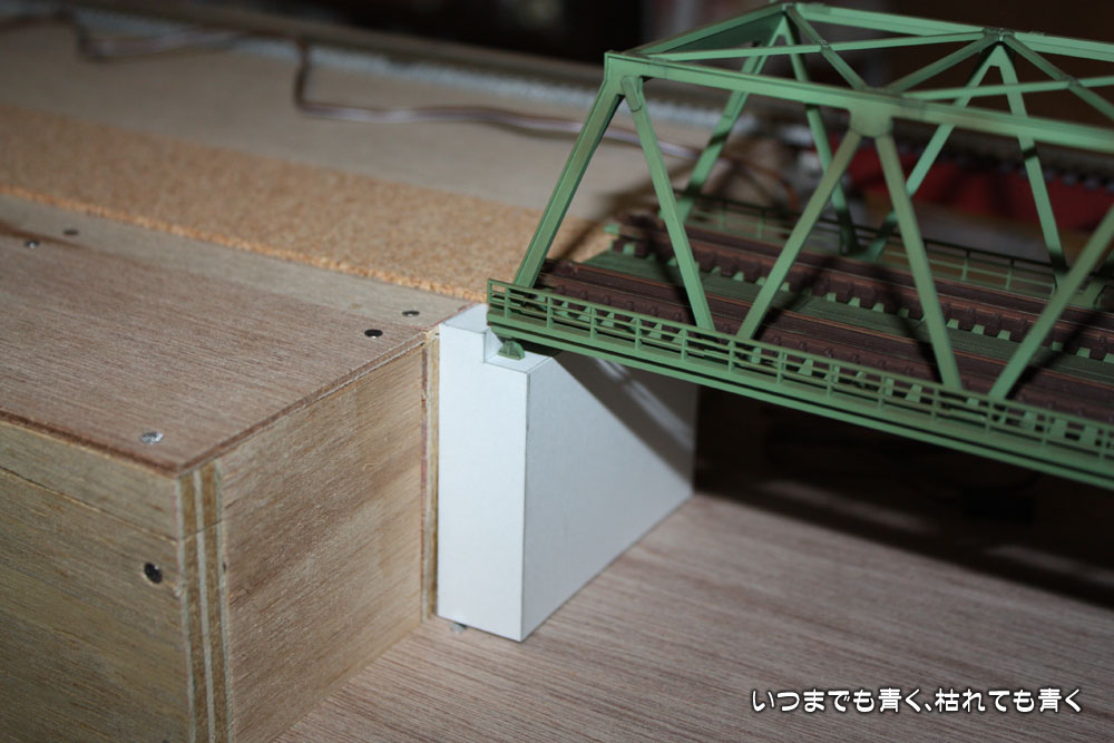 両端の橋脚 レイアウト製作 2011年2月24日(木) 23:592023年11月30日(木) 0:53 今日は複線トラス鉄橋の両端の橋脚の製作です。 付属の橋脚では鉄橋と土手の部分とのつなぎ目の処理が不自然になるので、土手から続くような橋脚にしたほうがリアルかなと思って作ったのが右の橋脚です。0.5mm厚のボール紙からパーツを切り出して木工用ボンドでの組み立てです。鉄橋をのせてみると、ぴったりとおさまります。高さも問題ありません。線路の防音対策は、最終的には2mm厚のコルクシートにすることにしましたので、橋脚もその分を考慮した高さになっています。 橋脚の塗装は後日まとめておこなう予定です。