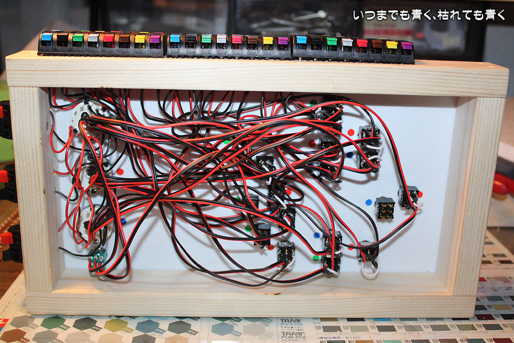 そういう体調なのでさすがに今日はでかけるのはやめにして、作りかけのコントロールボードの配線をおこないました。今回製作しているものは最終版ではなく、とりあえず敷設した線路で車両を走らせるための暫定版ですので、配線もハンダでの芋付けです。きれいな配線の引き回しも考えていません。きちんと通電さえしていれば、機能的には大丈夫ですからね。