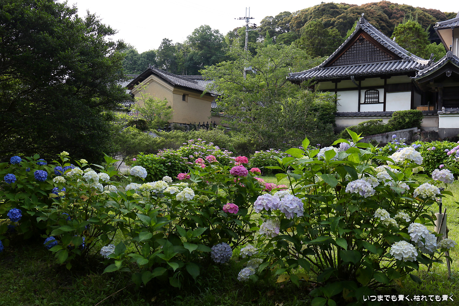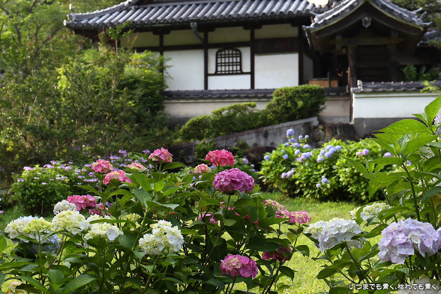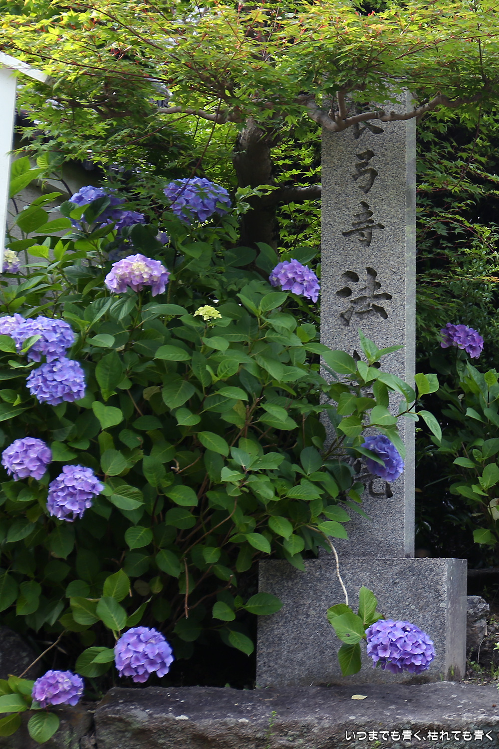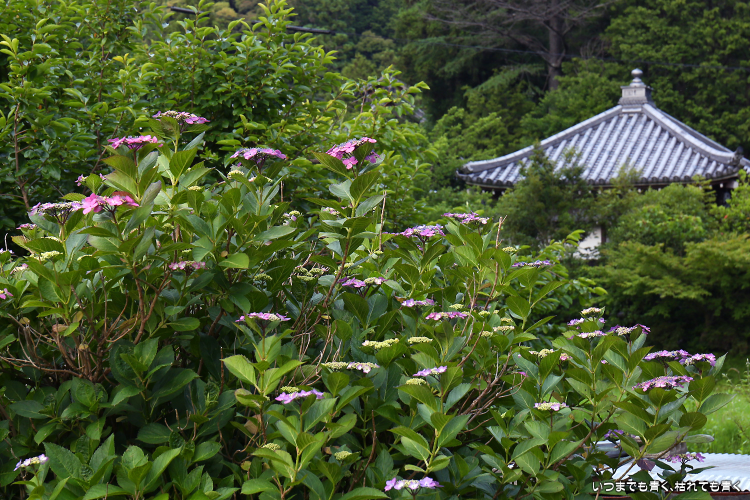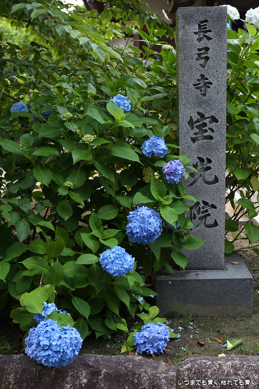 長弓寺は、4つの塔頭寺院(法華院、薬師院、円生院、宝光院)があり、無住の宝光院を除く3つの寺院で長弓寺を管理しています。奈良の紫陽花のある寺社を検索して見つけました。本堂は重要文化財に指定されています。生駒市はちょっと遠かったのですが、初めての所は行っておかないと後悔するので、到着時刻が4時半を過ぎるのはわかっていましたが無理して向かいました。なんとか本堂を参拝し、薬師院で御朱印をいただき、そこで本堂の建築の特徴を伺いました。紫陽花は期待していた感じではありませんでした。参道に普通に紫陽花が咲いているだけでした。それでも、なんとかいろいろと撮影しましたが、夕刻で十分な光量を得ることができず、手持ち撮影ではピントがイマイチとなってしまいました。