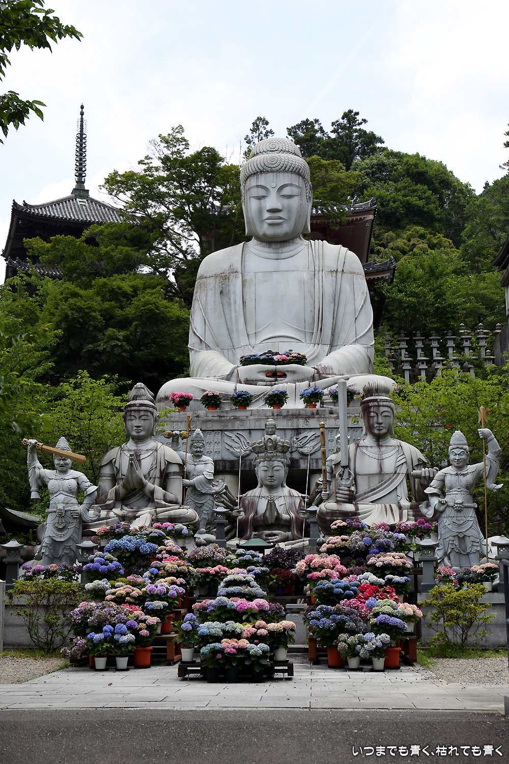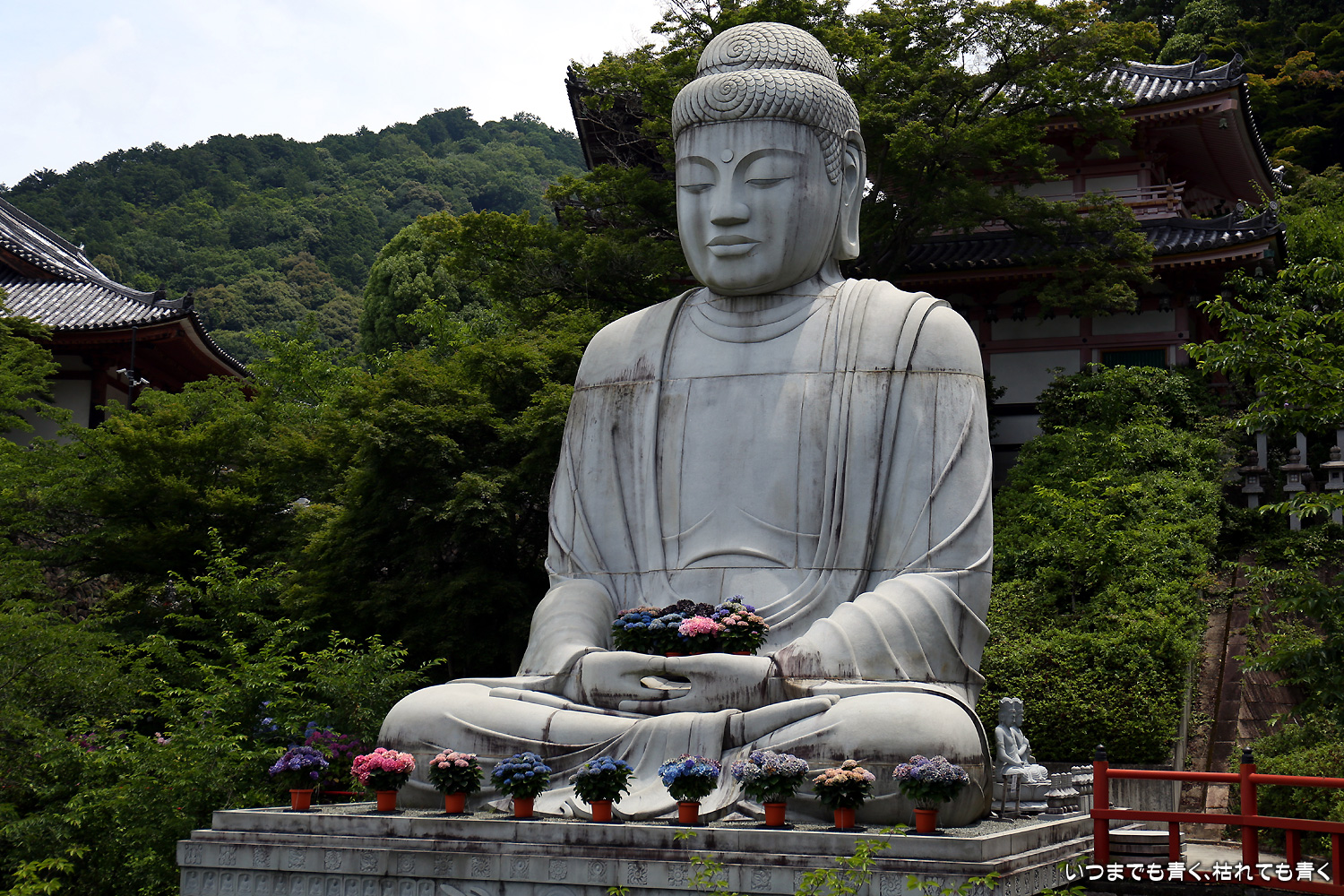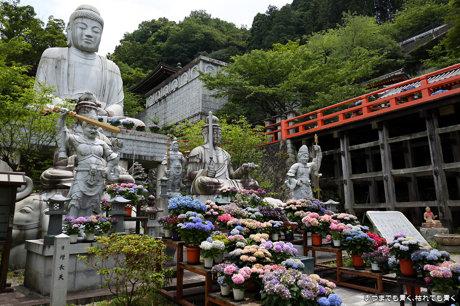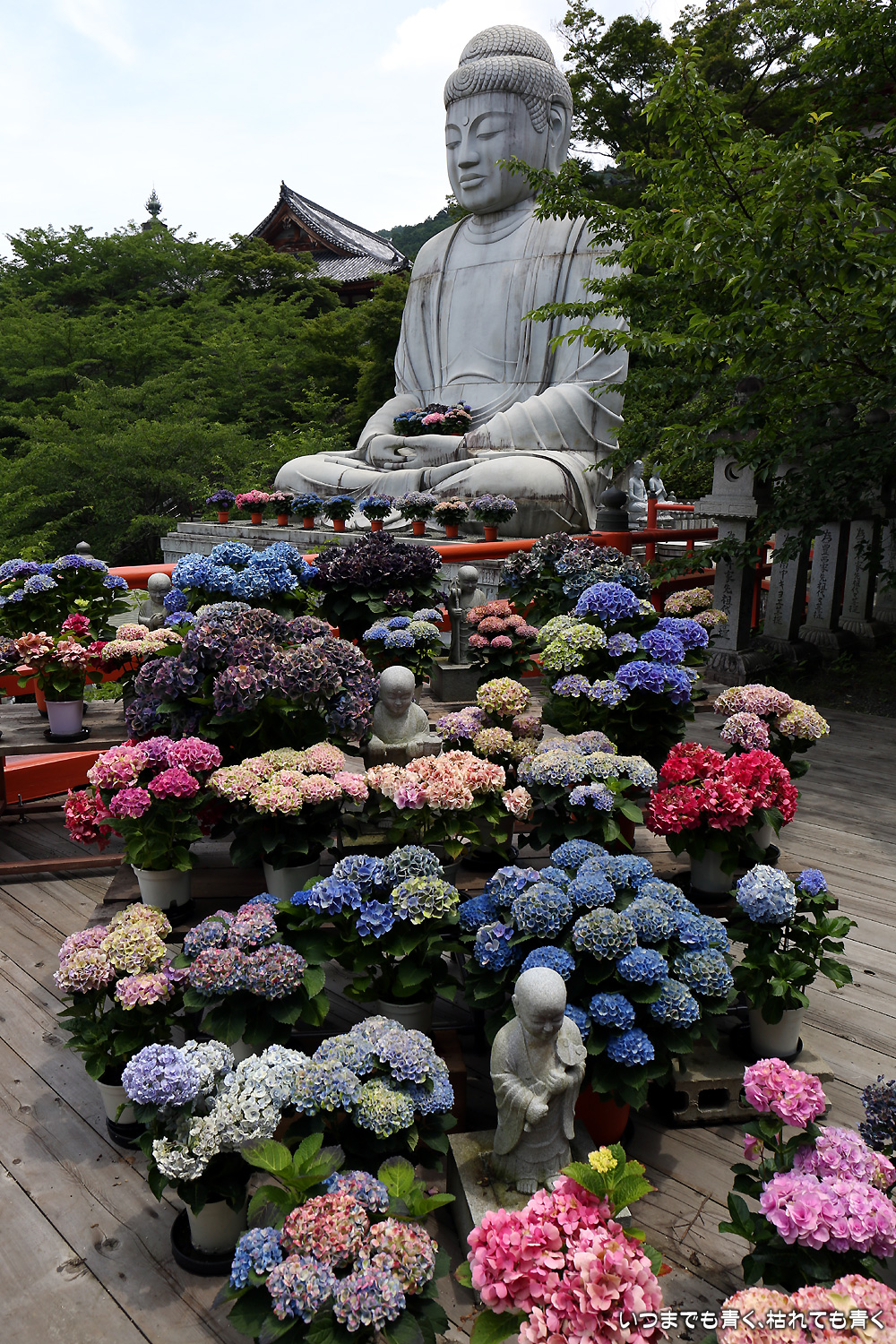 大和三大観音「あぢさゐ回廊」の三つ目、壺阪寺です。壷阪寺は、昨年の春に桜大仏を見に来て以来2度目です。「あぢさゐ回廊」の鉢植えは、ここも岡寺同様、変色しているものもあり、鉢植えの数も少なくなっているようですが、全体を撮影するには問題ありませんでした。大仏と鉢植えの紫陽花との写真は似たような写真が多くなりましたが、微妙に変化をつけて撮影してみました。「あぢさゐ回廊」の切り絵御朱印もいただき、岡寺では売り切れだった台紙も購入できてよかったです。紫陽花ではないので写真はここに掲載していませんが、新緑の中の大仏、新緑大仏も撮影してきました。
