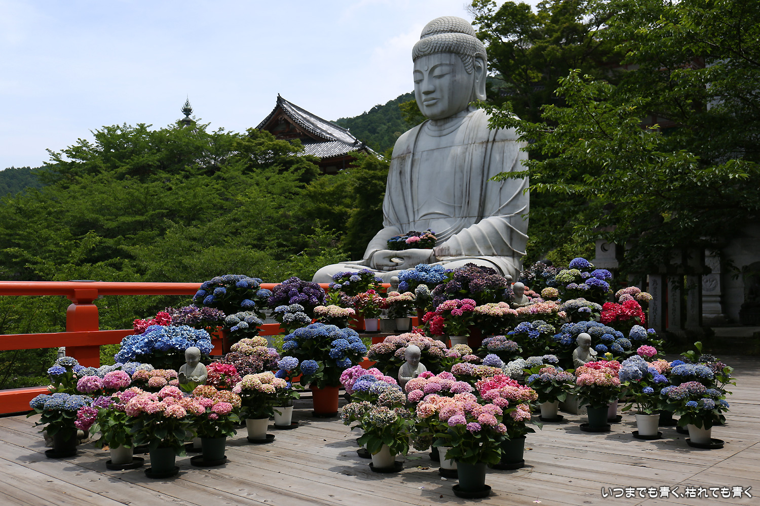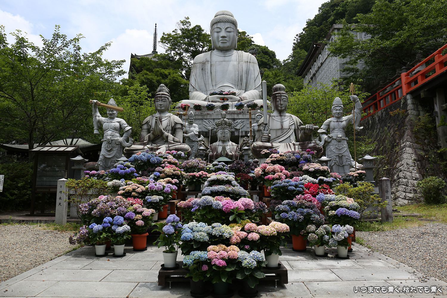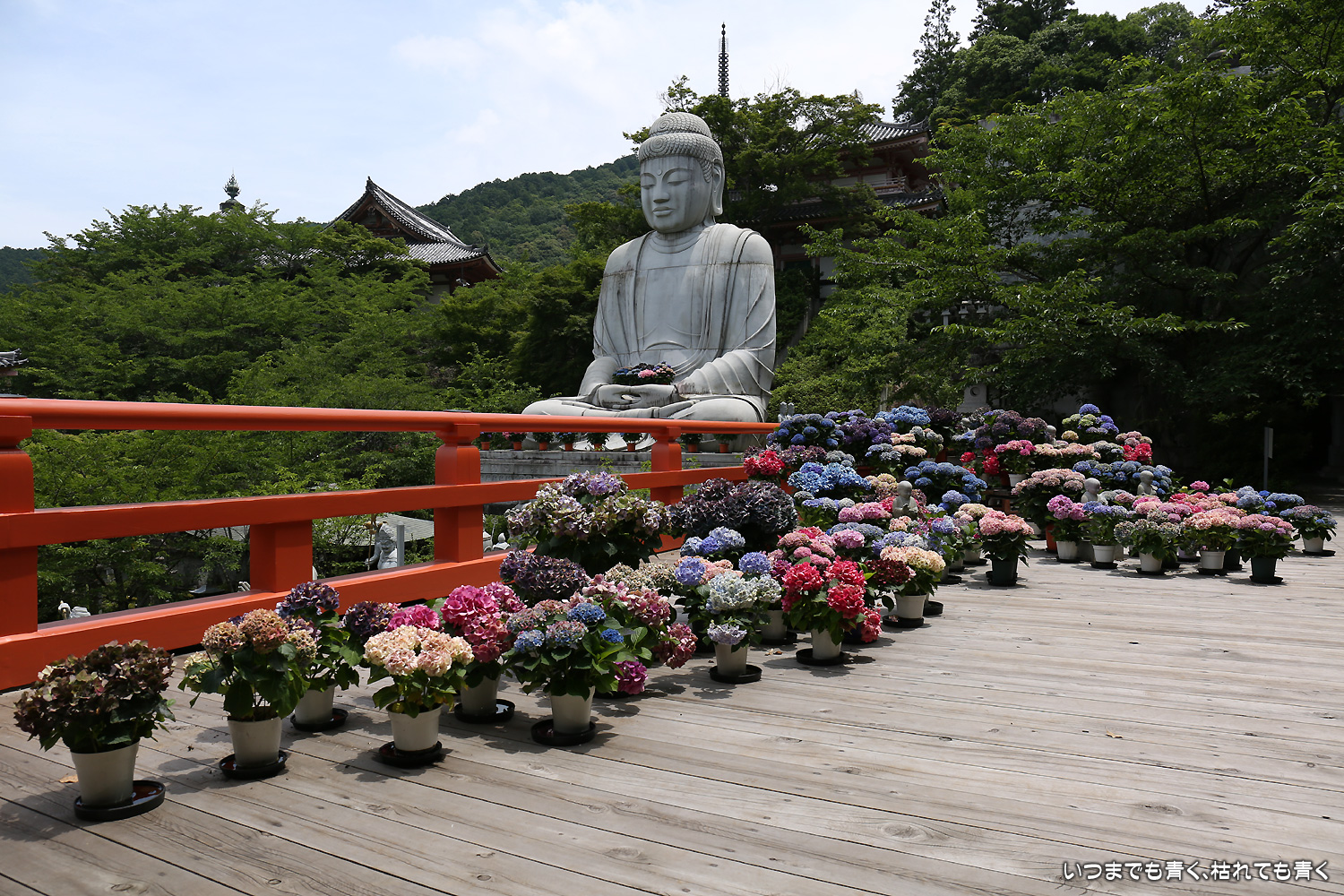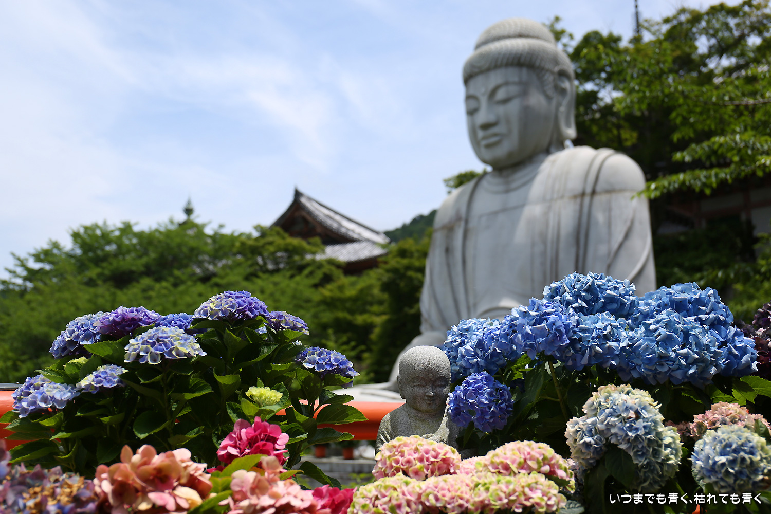 大和三大観音「あぢさゐ回廊」の三つ目、壺阪寺です。壷阪寺は、昨年の春に桜大仏を見に来て以来2度目です。「あぢさゐ回廊」の鉢植えは、ここも岡寺同様、変色しているものもあり、鉢植えの数も少なくなっているようですが、全体を撮影するには問題ありませんでした。大仏と鉢植えの紫陽花との写真は似たような写真が多くなりましたが、微妙に変化をつけて撮影してみました。「あぢさゐ回廊」の切り絵御朱印もいただき、岡寺では売り切れだった台紙も購入できてよかったです。紫陽花ではないので写真はここに掲載していませんが、新緑の中の大仏、新緑大仏も撮影してきました。