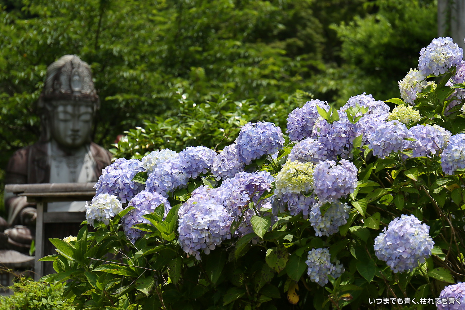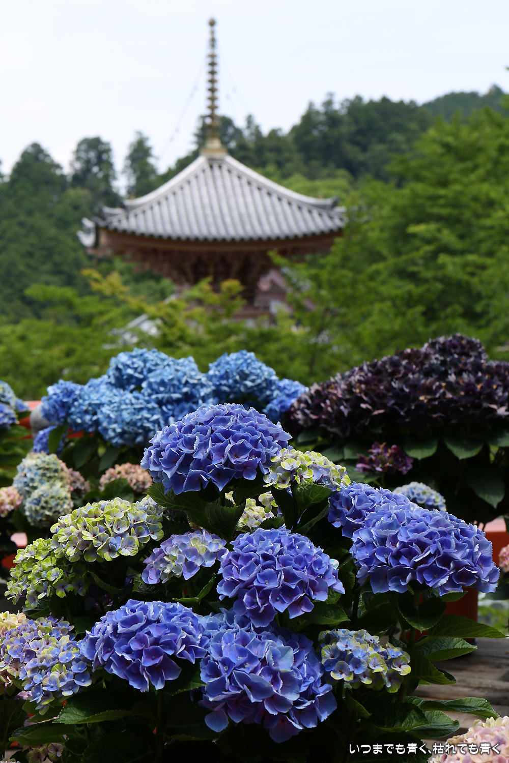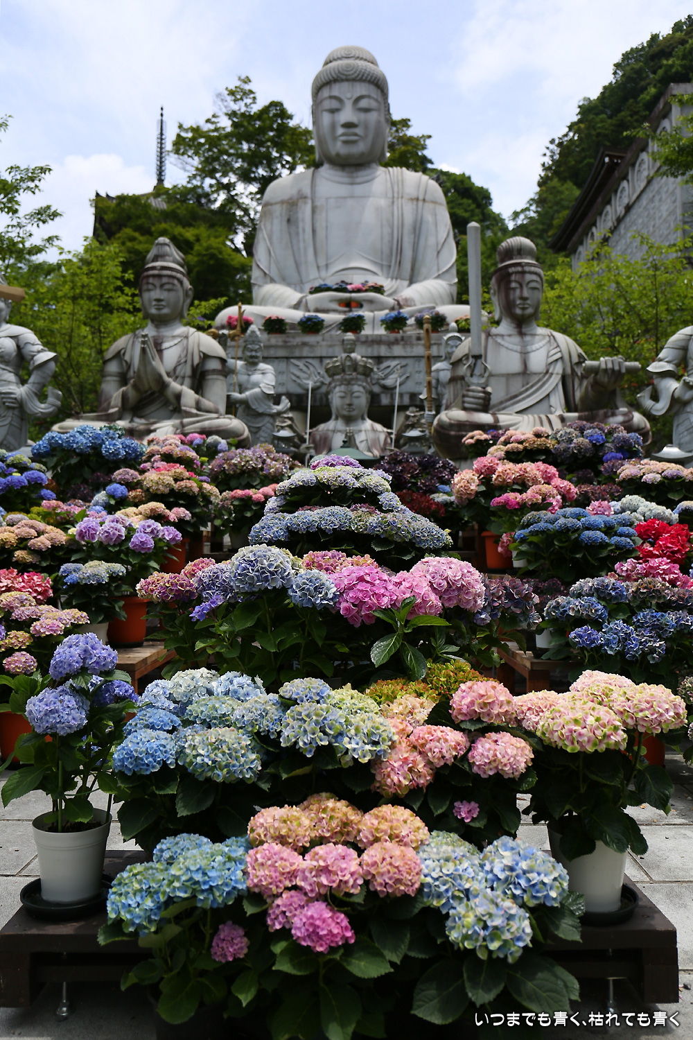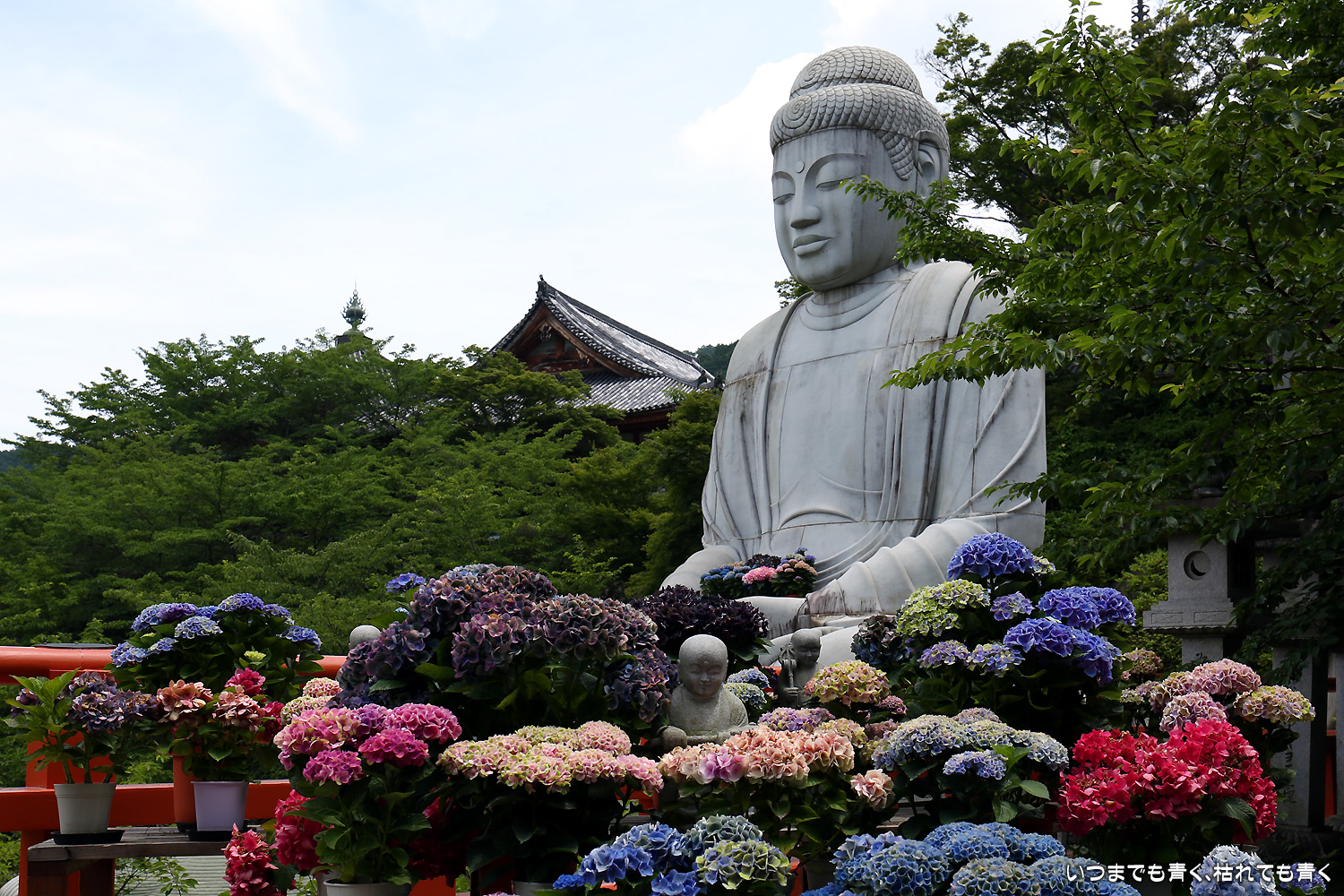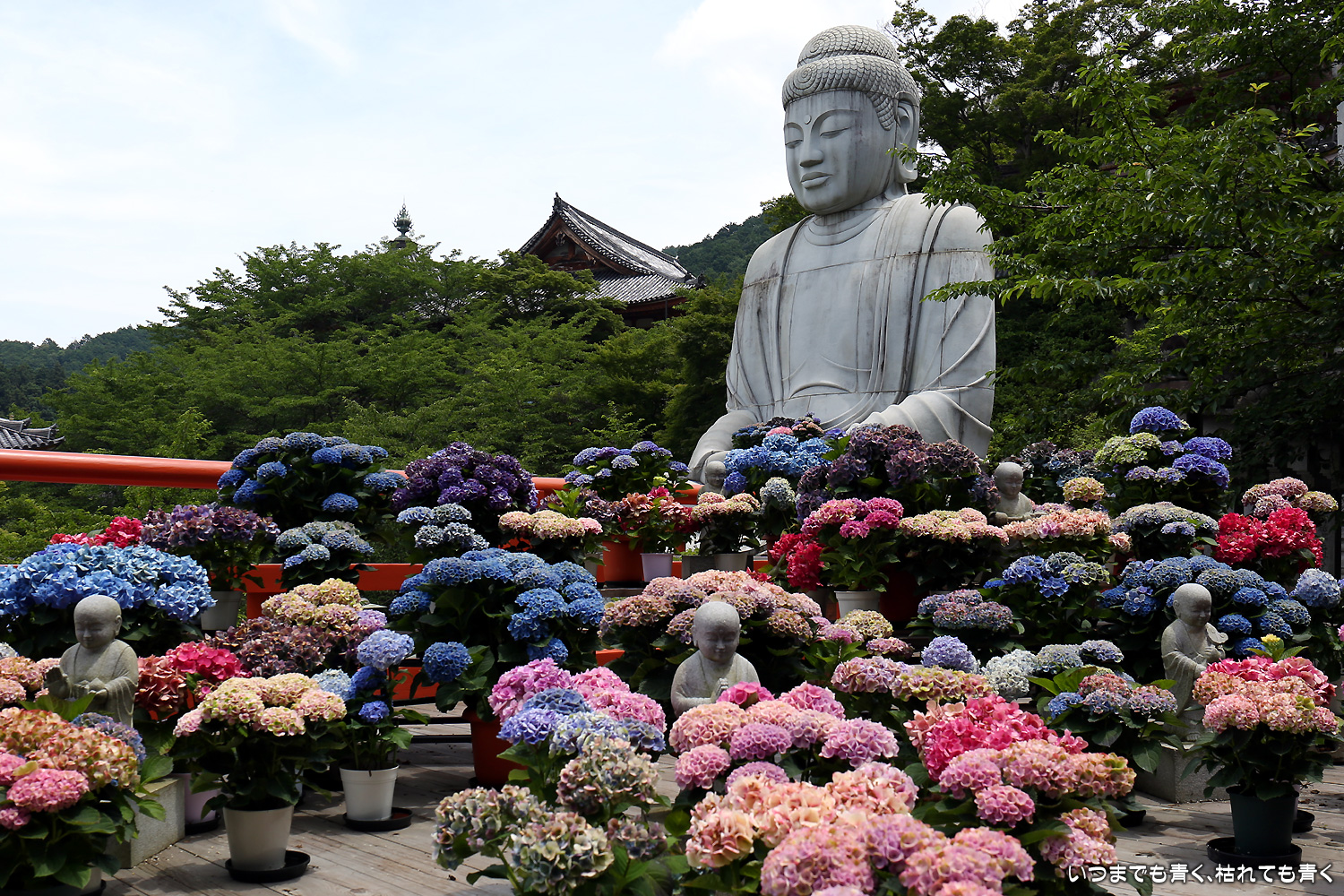 大和三大観音「あぢさゐ回廊」の三つ目、壺阪寺です。壷阪寺は、昨年の春に桜大仏を見に来て以来2度目です。「あぢさゐ回廊」の鉢植えは、ここも岡寺同様、変色しているものもあり、鉢植えの数も少なくなっているようですが、全体を撮影するには問題ありませんでした。大仏と鉢植えの紫陽花との写真は似たような写真が多くなりましたが、微妙に変化をつけて撮影してみました。「あぢさゐ回廊」の切り絵御朱印もいただき、岡寺では売り切れだった台紙も購入できてよかったです。紫陽花ではないので写真はここに掲載していませんが、新緑の中の大仏、新緑大仏も撮影してきました。
