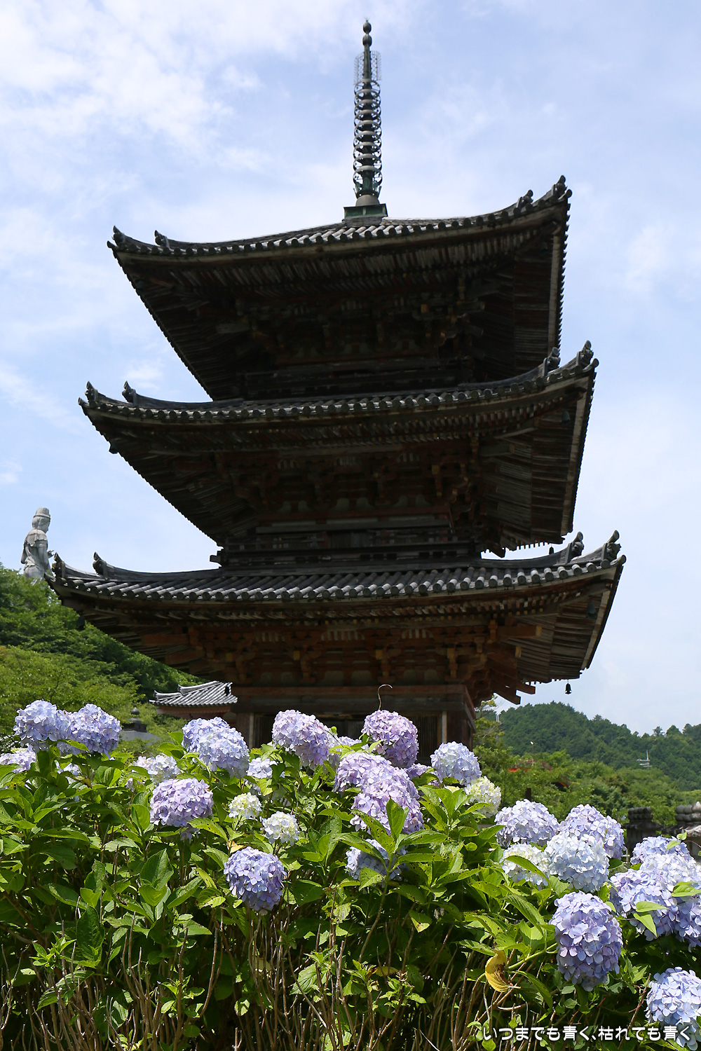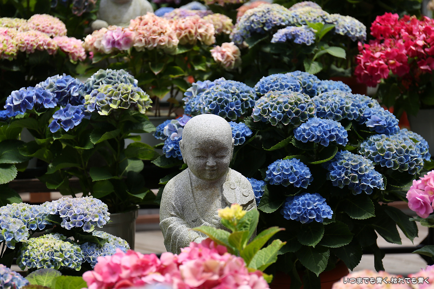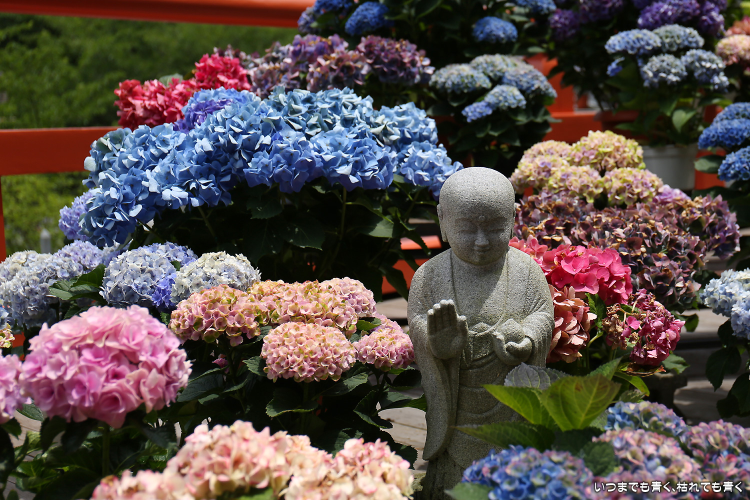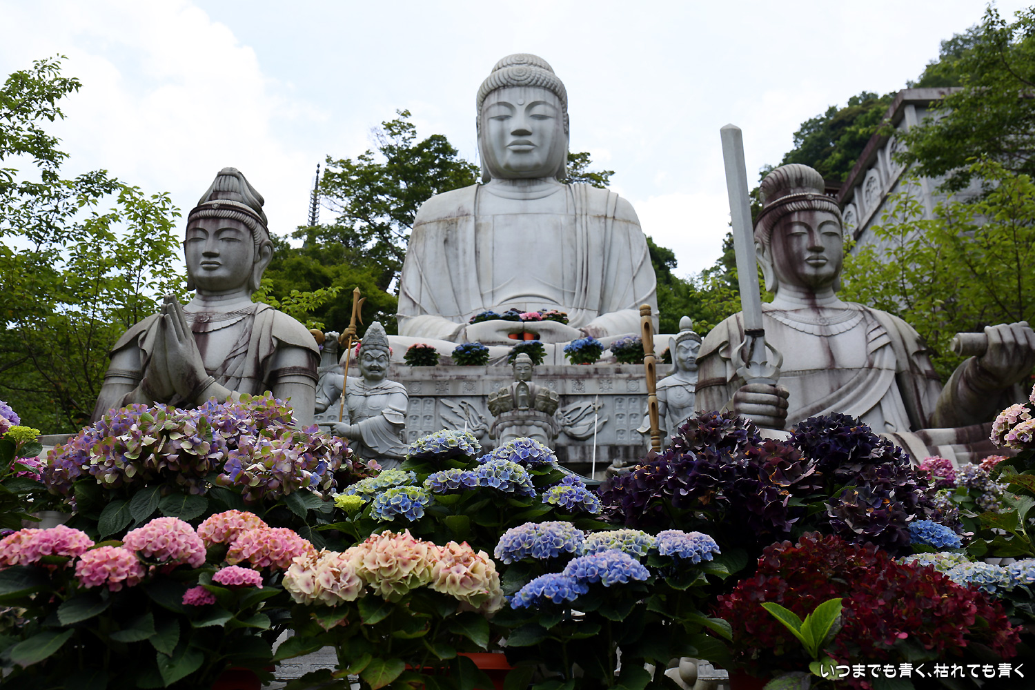 大和三大観音「あぢさゐ回廊」の三つ目、壺阪寺です。壷阪寺は、昨年の春に桜大仏を見に来て以来2度目です。「あぢさゐ回廊」の鉢植えは、ここも岡寺同様、変色しているものもあり、鉢植えの数も少なくなっているようですが、全体を撮影するには問題ありませんでした。大仏と鉢植えの紫陽花との写真は似たような写真が多くなりましたが、微妙に変化をつけて撮影してみました。「あぢさゐ回廊」の切り絵御朱印もいただき、岡寺では売り切れだった台紙も購入できてよかったです。紫陽花ではないので写真はここに掲載していませんが、新緑の中の大仏、新緑大仏も撮影してきました。