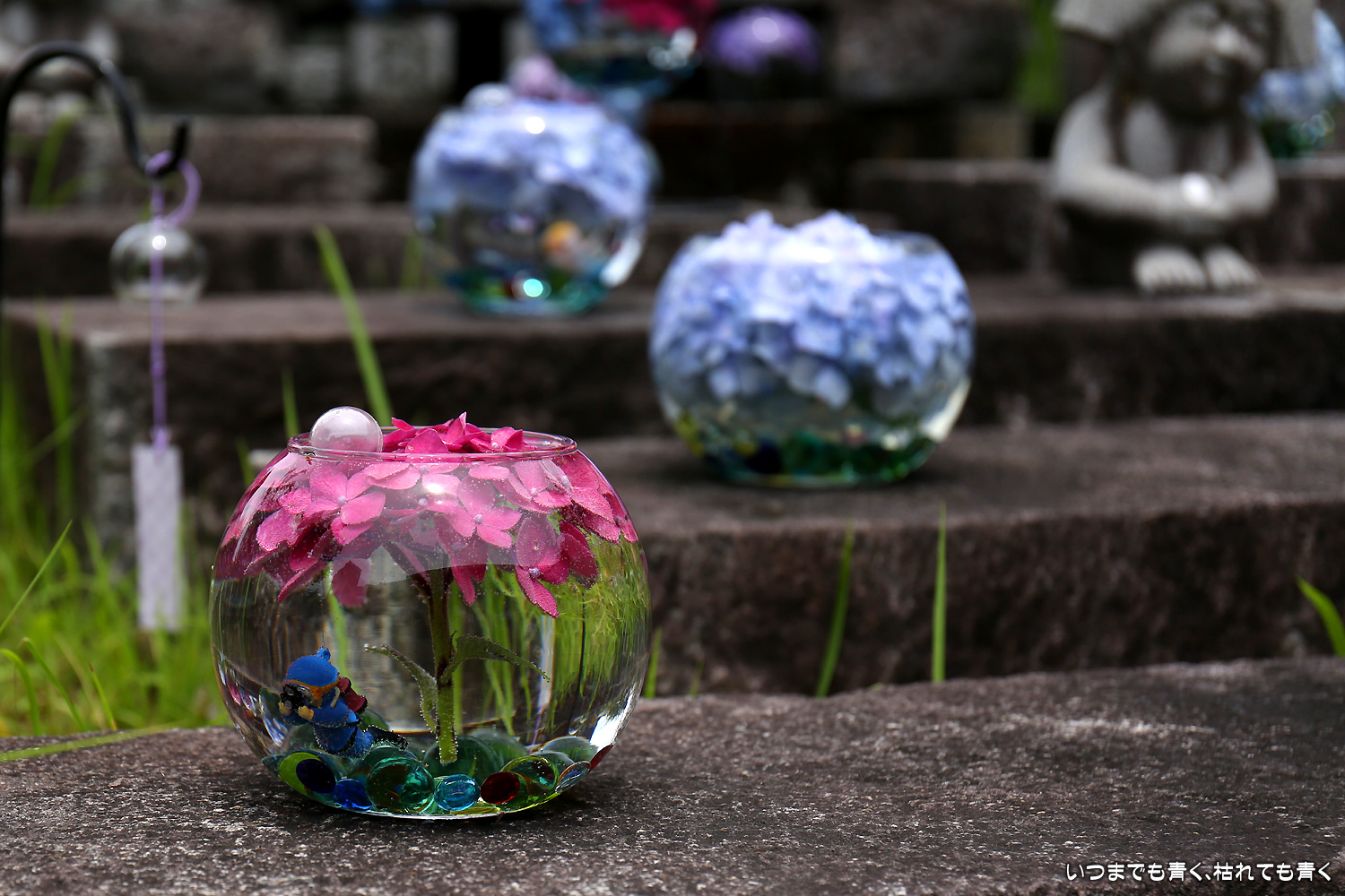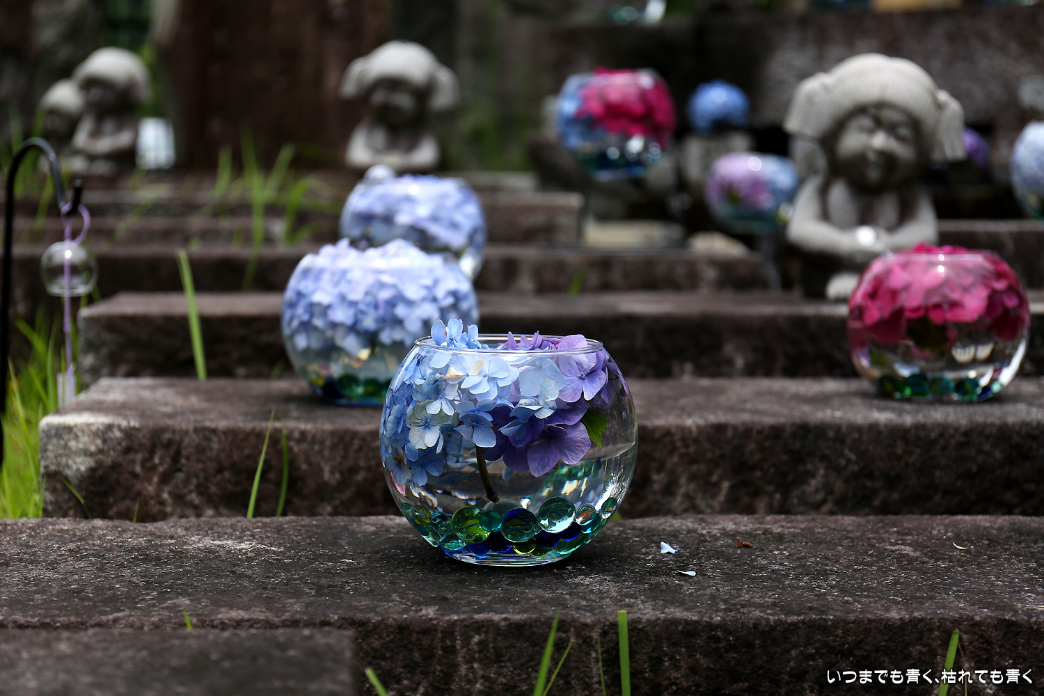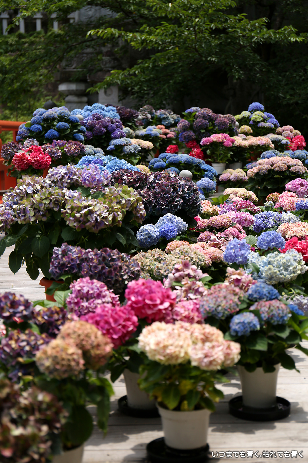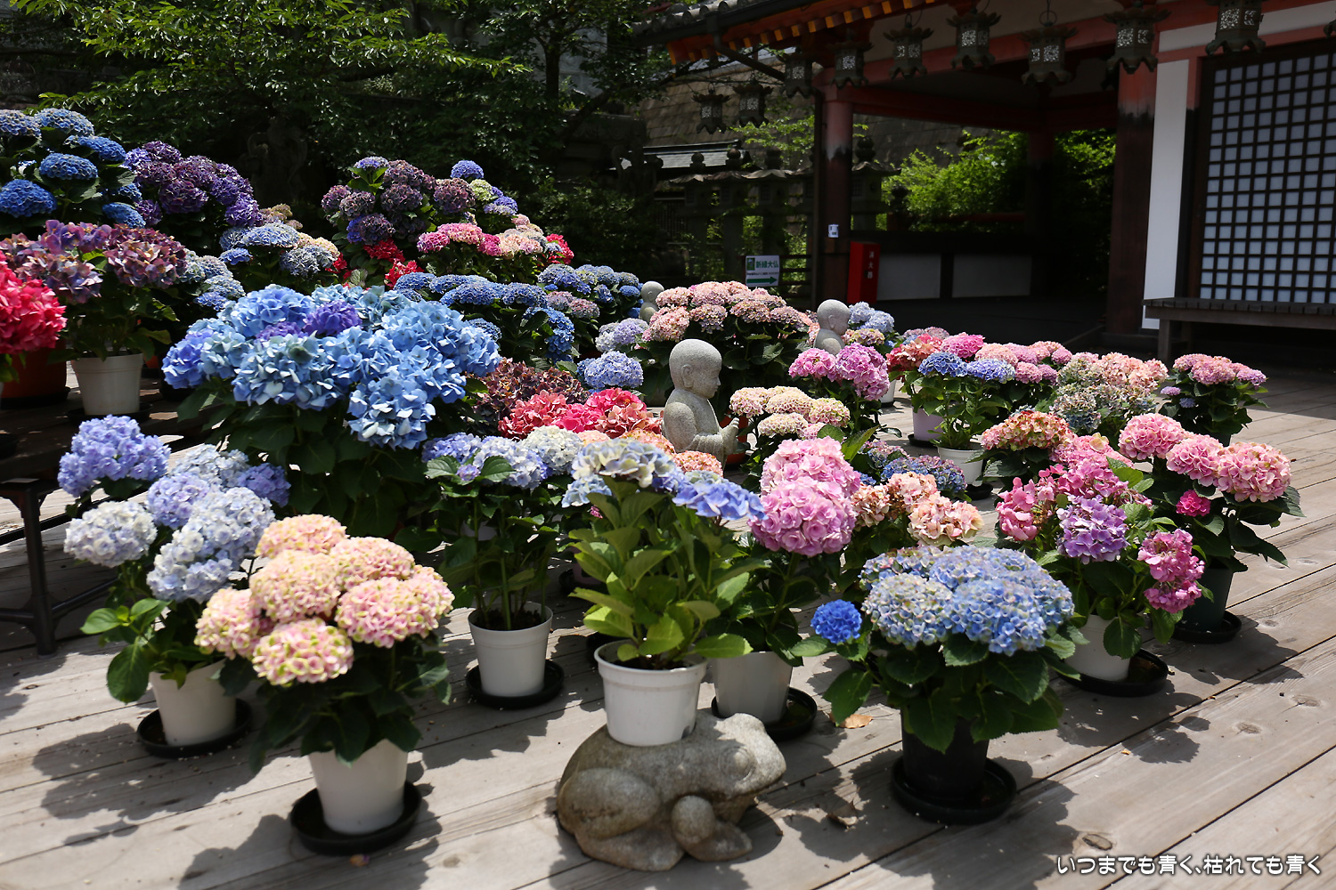 大和三大観音「あぢさゐ回廊」の三つ目、壺阪寺です。壷阪寺は、昨年の春に桜大仏を見に来て以来2度目です。「あぢさゐ回廊」の鉢植えは、ここも岡寺同様、変色しているものもあり、鉢植えの数も少なくなっているようですが、全体を撮影するには問題ありませんでした。大仏と鉢植えの紫陽花との写真は似たような写真が多くなりましたが、微妙に変化をつけて撮影してみました。「あぢさゐ回廊」の切り絵御朱印もいただき、岡寺では売り切れだった台紙も購入できてよかったです。紫陽花ではないので写真はここに掲載していませんが、新緑の中の大仏、新緑大仏も撮影してきました。
