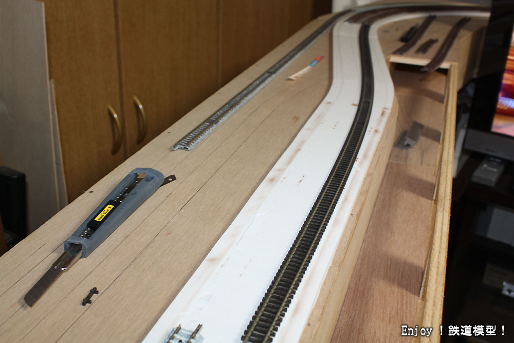 しばらく忙しくて作業ができませんでしたが、ようやく問題の直線の入ったS字の部分をフレキシブルレールに置き換える作業を開始しました。