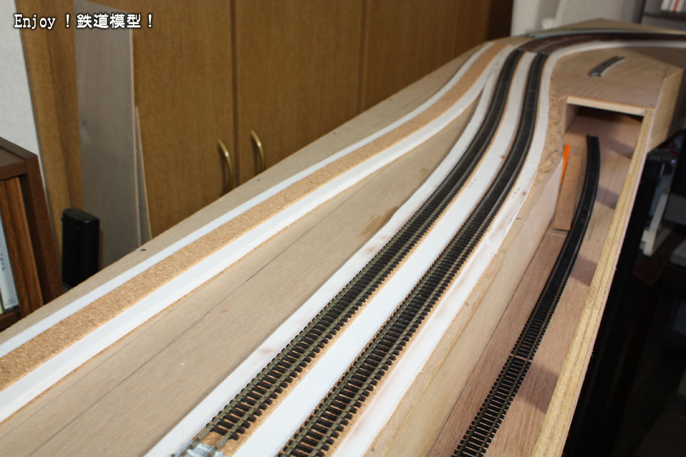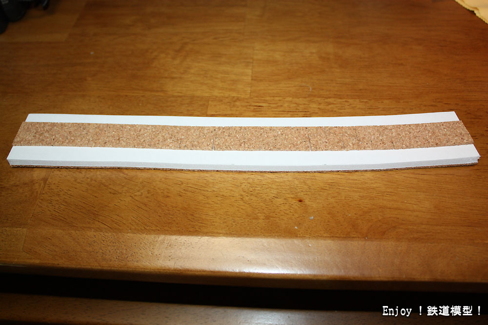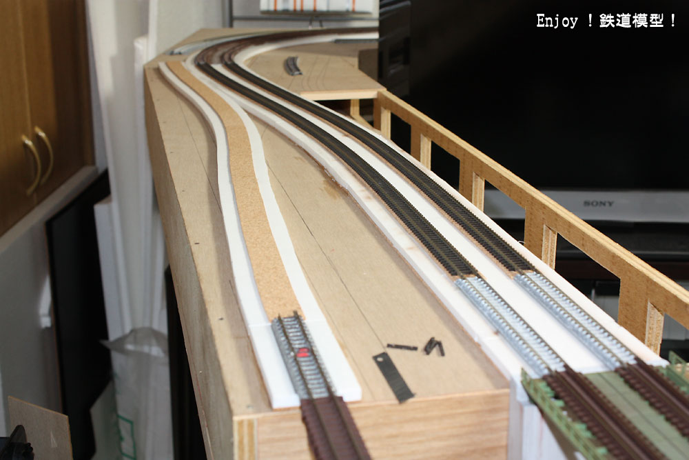 フレキシブルレールを仮置きして、緩やかなカーブの形を写してポップコーアとコルクシートでベースを作っていきます。緩やかなカーブは、ファイントラックのカーブレールとは違い、ベースを作っていてもカーブというより直線に近い感じです。本物の鉄道のカーブもそういう感じなんでしょうね。
